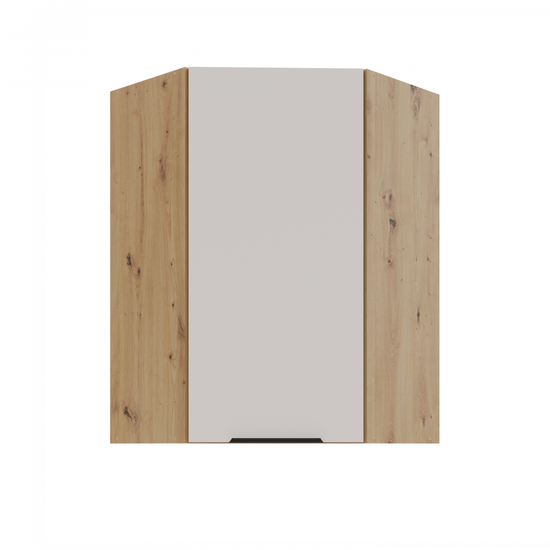 Horní skříňka ze systému SOLEA - rohová skříňka do kuchyňské linky je vybavena dvířky s širokým kovovým úchytem. Dvířka skříněk jsou vyrobeny v dekoru Kašmír.