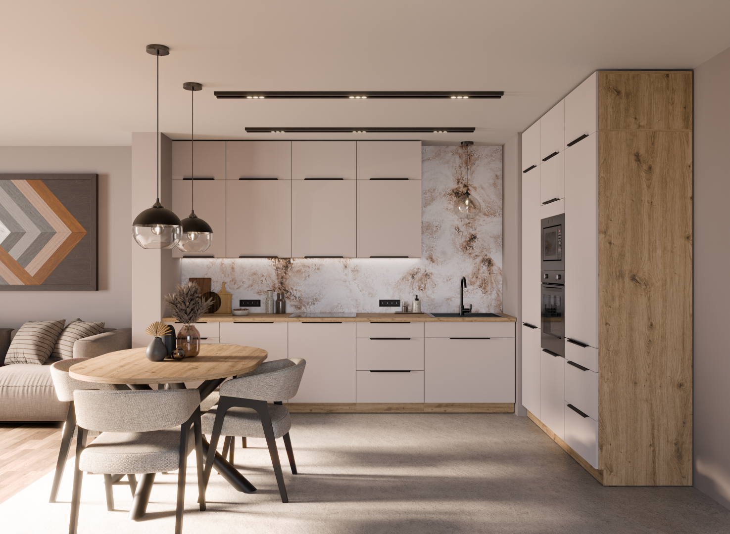 Moderní kuchyňská linka SOLEA 3 v barevném provedení korpus dub Artisan + dvířka Kašmír. Kuchyňská linka má atraktivní moderní vzhled je tak ideální volbou pro Vaši kuchyni. Dvířka kuchyňských skříněk nebo šuplíků mají tiché dovírání. U skříněk s výklopem se dvířka zvedají pomocí plynových pístů. V ceně kuchyňské linky jsou kovové úchyty. U šuplíků velikosti 40, 60 a 80 cm jsou boky šuplíků kovové - PREMIUM BOX.