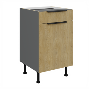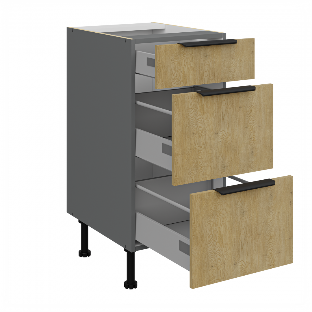 Spodní zásuvková skříňka ze systému CREMONA ANTRACIT - zásuvková skříňka do kuchyňské linky je uzavíratelná praktickými šuplíky s širokými kovovými úchyty. Šuplíky skříňky jsou vyrobeny v dekoru dub Cremona.