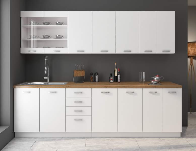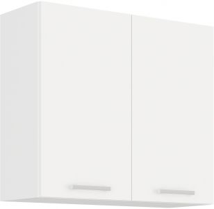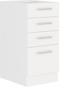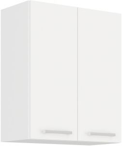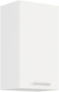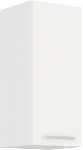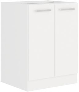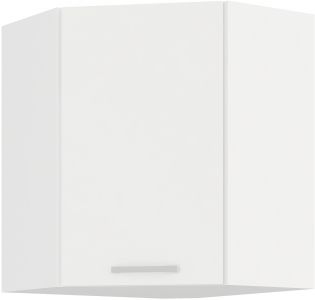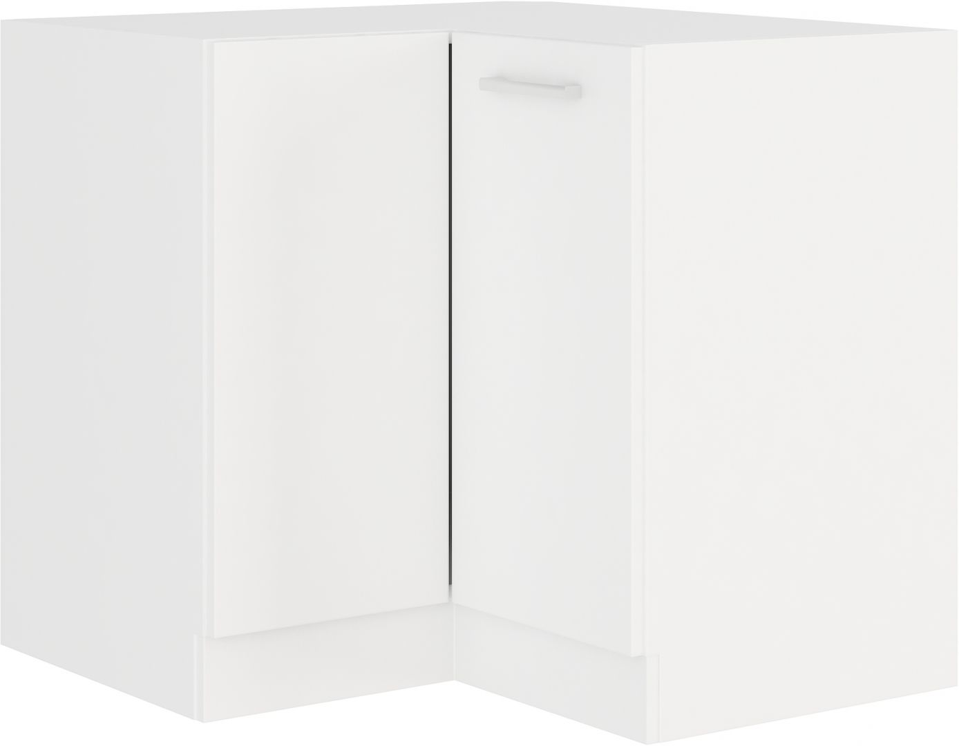 Spodní rohová skříňka ze systému EKO VHITE - rohová skříňka do kuchyňské linky je uzavíratelná praktickými dvířky se širokými úchyty. Dvířka skříněk jsou provedené v dekoru bílého matu.