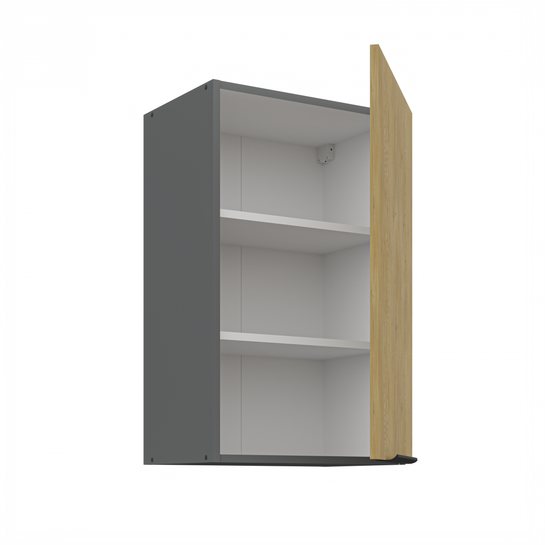 Horní otevírací skříňka ze systému CREMONA ANTRACIT - skříňka do kuchyňské linky je uzavíratelná praktickými dvířky se širokými úchyty. Dvířka skříněk jsou provedené v dekoru dub Cremona.