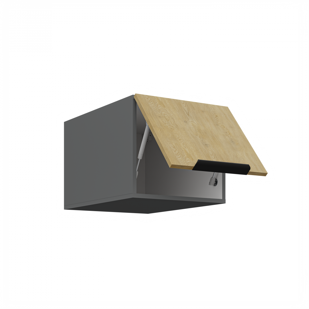 Horní výklopná skříňka ze systému CREMONA ANTRACIT - skříňka do kuchyňské linky je uzavíratelná praktickými dvířky se širokým úchytem. Dvířka skříněk jsou provedené v dekuru dub Cremona.