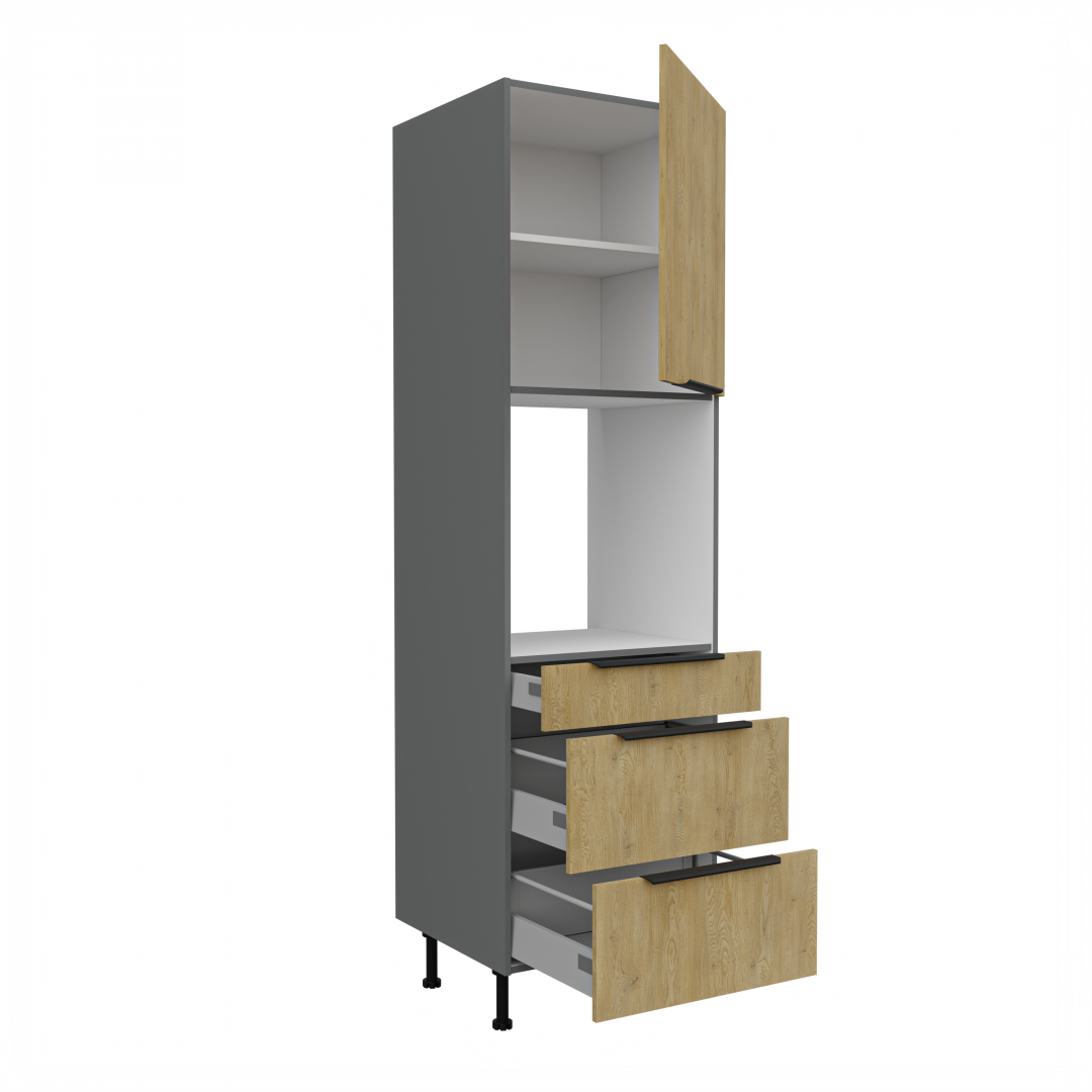 Vysoká skříň na vestavnou troubu ze systému CREMONA ANTRACIT - skříňka do kuchyňské linky je opatřena prostorem na vestavnou troubu, třemi výsuvnými šuplíky a otevíracími dvířky s kovovými úchyty. Dvířka skříněk jsou vyrobeny v dekoru dub Cremona.