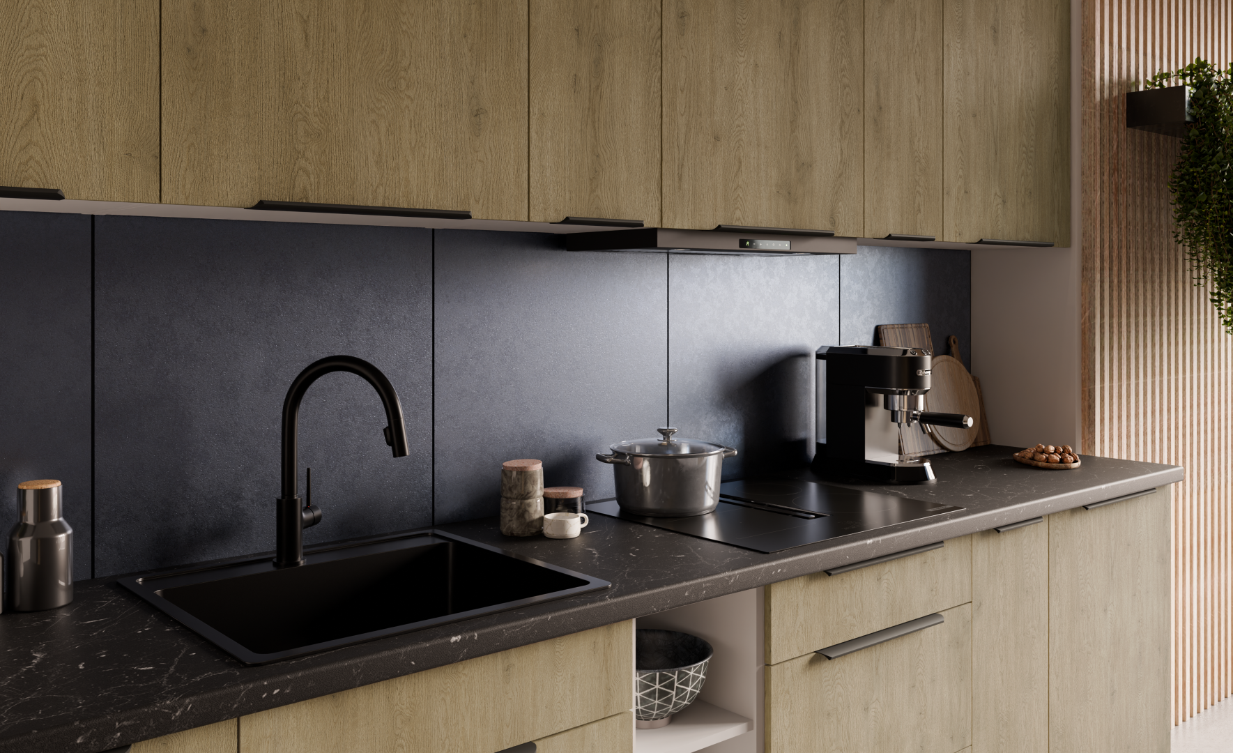 Pracovní deska není v ceně, ale je možné zakoupit desku buď v celku případně dělenou nad jednotlivé skříňky dle cen uvedených u pracovní desky. V uvedené sestavě je na obrázku prac. deska MRAMOR ROMA 38mm v černé variantě korpusu a prac. deska BÍLÁ 28mm v bílé variantě korpusu.