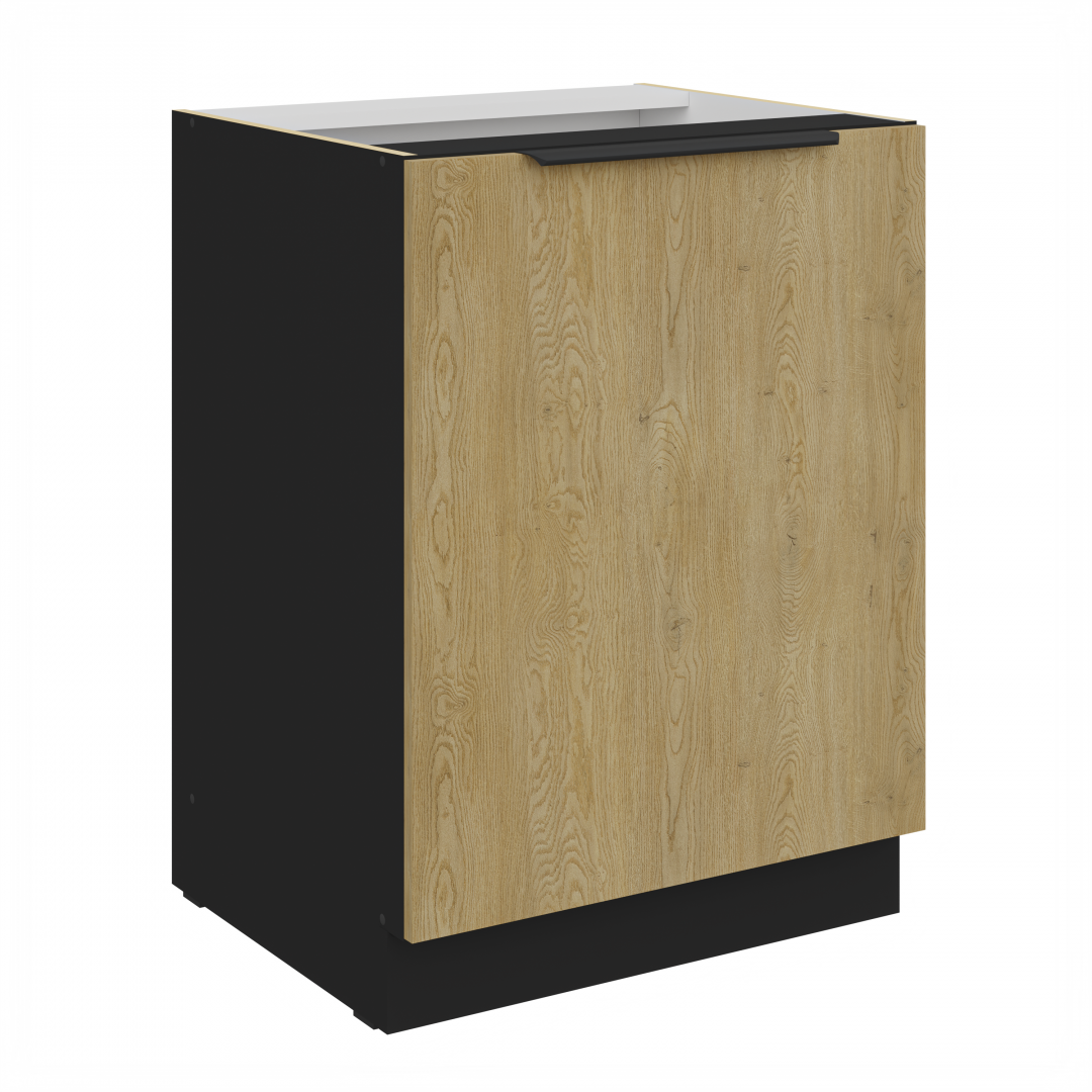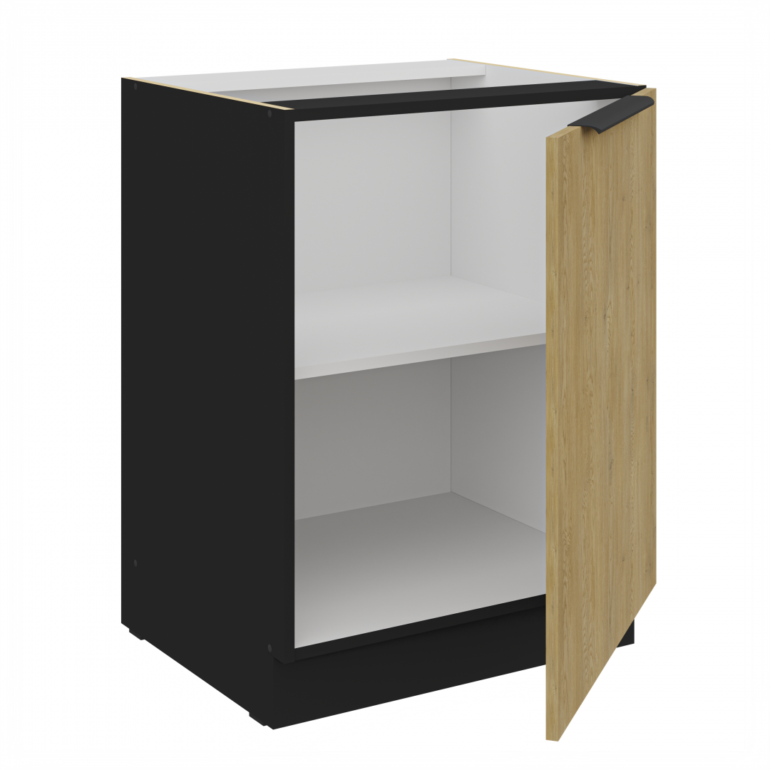 Spodní skříňka ze systému CREMONA - spodní skříňka do kuchyňské linky je uzavíratelná praktickými dvířky se širokými kovovými úchyty. Dvířka skříněk jsou vyrobeny v dekoru dub Cremona a u korpusu je na výběr dekor bílý nebo černý.