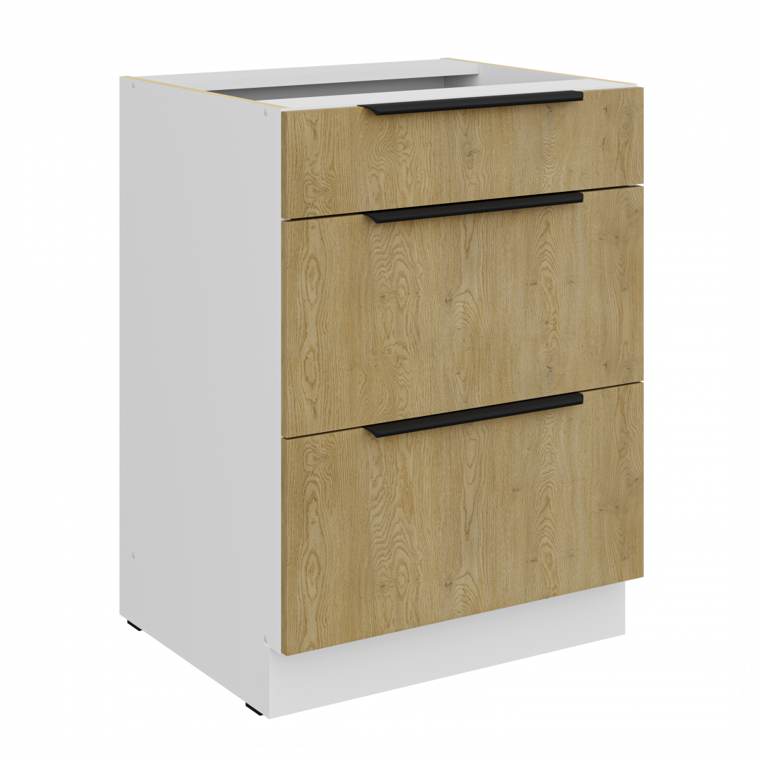 Spodní zásuvková skříňka ze systému CREMONA - zásuvková skříňka do kuchyňské linky je uzavíratelná praktickými šuplíky s širokými kovovými úchyty. Šuplíky skříňky jsou vyrobeny v dekoru dub Cremona a u korpusu je na výběr dekor bílý nebo černý.