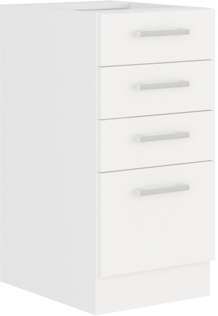 Spodní zásuvková skříňka ze systému EKO VHITE - skříňka do kuchyňské linky je opatřena čtyřmi výsuvnými šuplíky se širokými úchyty. Dvířka skříněk jsou provedené v dekoru bílý mat.