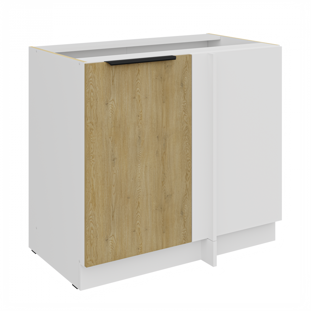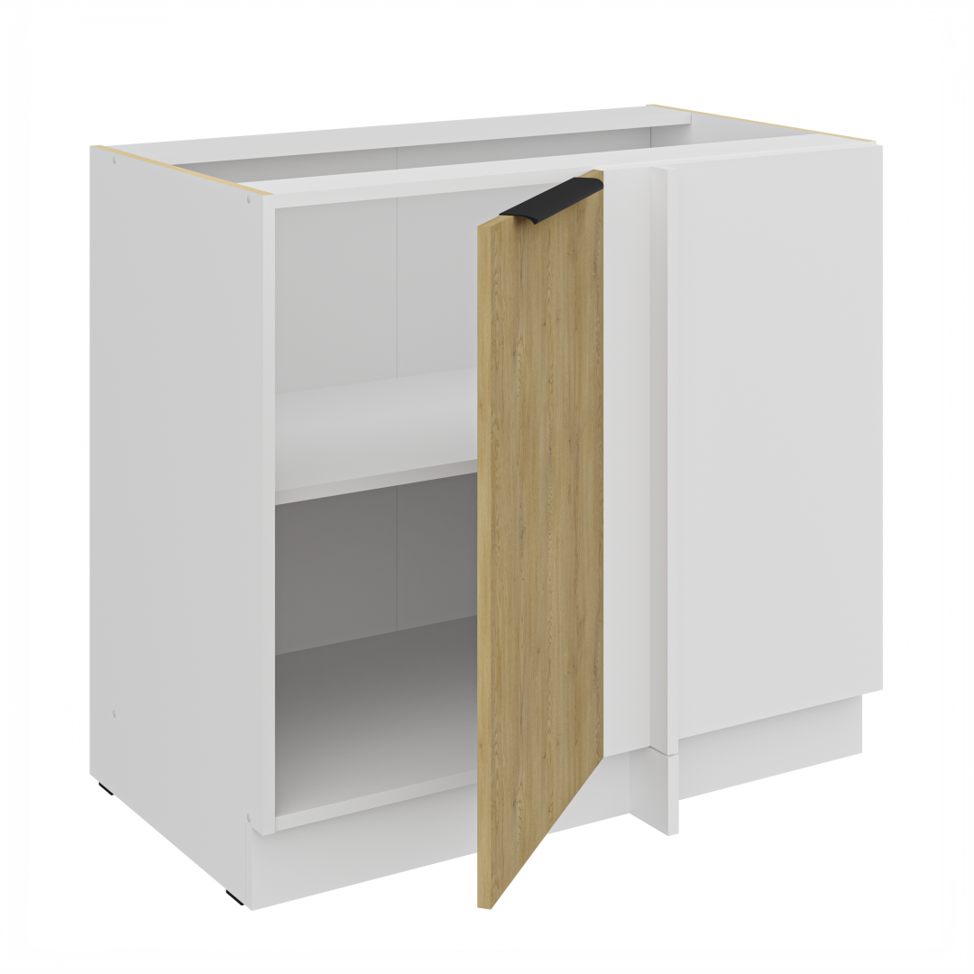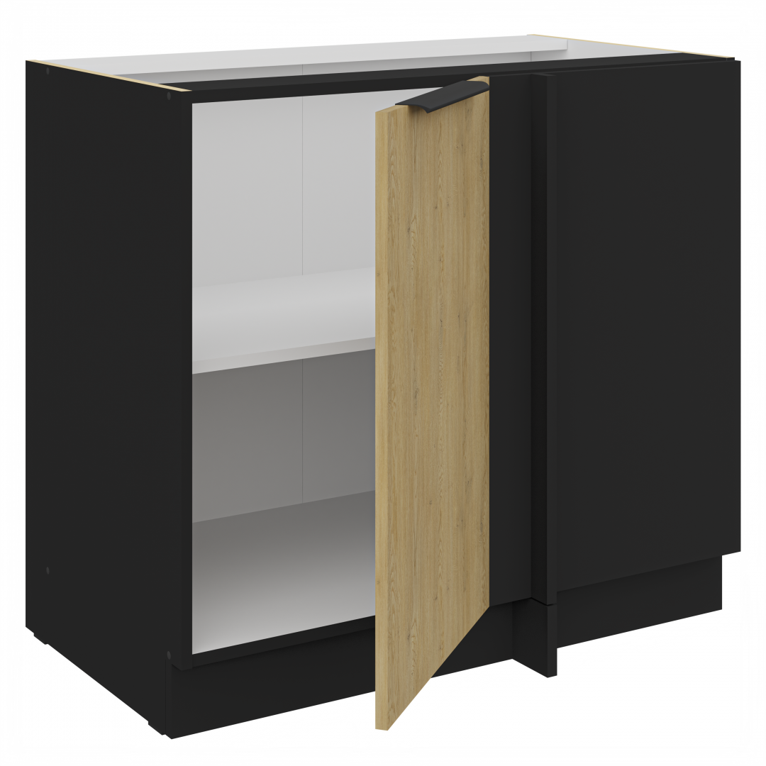 Spodní rohová skříňka ze systému CREMONA - skříňka do kuchyňské linky je vybavena dvířky s širokým kovovým úchytem. Dvířka skříněk jsou vyrobeny v dekoru dub Cremona a u korpusu je na výběr dekor bílý nebo černý.