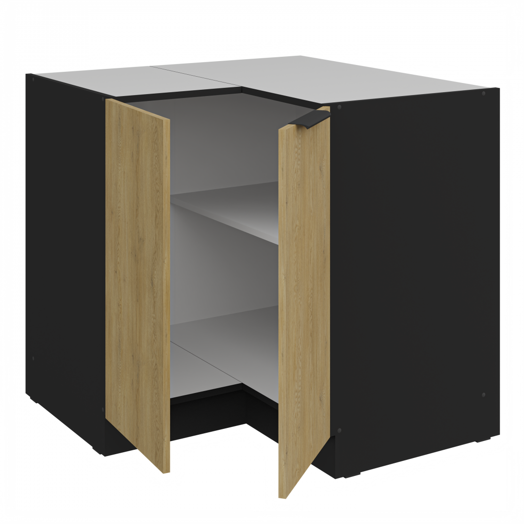 Spodní rohová skříňka ze systému CREMONA - skříňka do kuchyňské linky je vybavena dvířky s širokým kovovým úchytem. Dvířka skříněk jsou vyrobeny v dekoru dub Cremona a u korpusu je na výběr dekor bílý nebo černý.