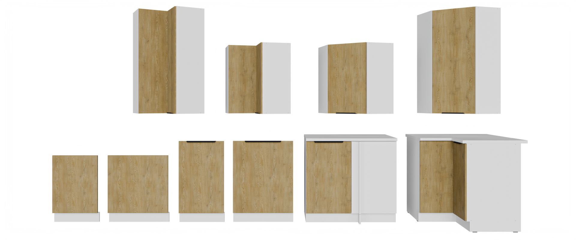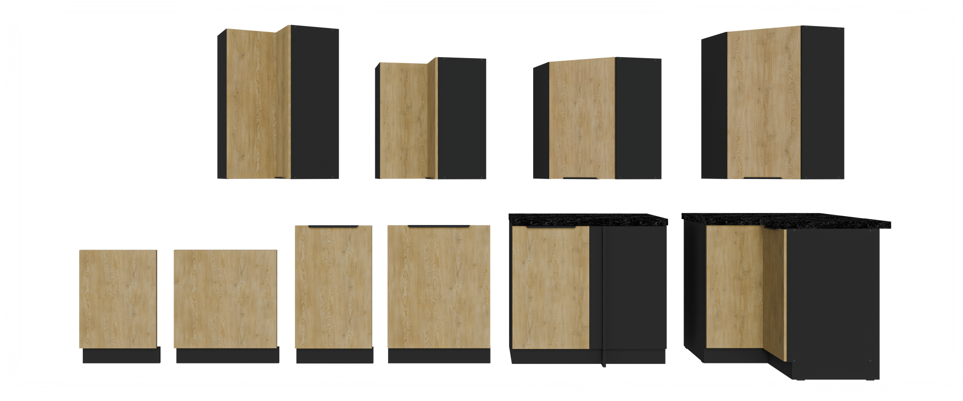 Horní skříňka ze systému CREMONA - rohová skříňka do kuchyňské linky je vybavena dvířky s širokým kovovým úchytem. Dvířka skříněk jsou vyrobeny v dekoru dub Cremona a u korpusu je na výběr dekor bílý nebo černý.