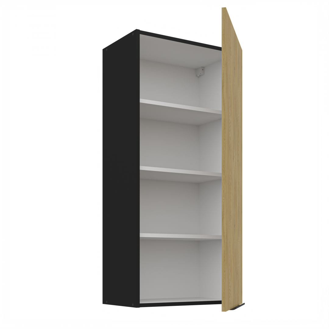 Horní otevírací skříňka ze systému CREMONA - skříňka do kuchyňské linky je uzavíratelná praktickými dvířky se širokými úchyty. Dvířka skříněk jsou provedené v dekoru dub Cremona a u korpusu je na výběr dekor bílý nebo černý.