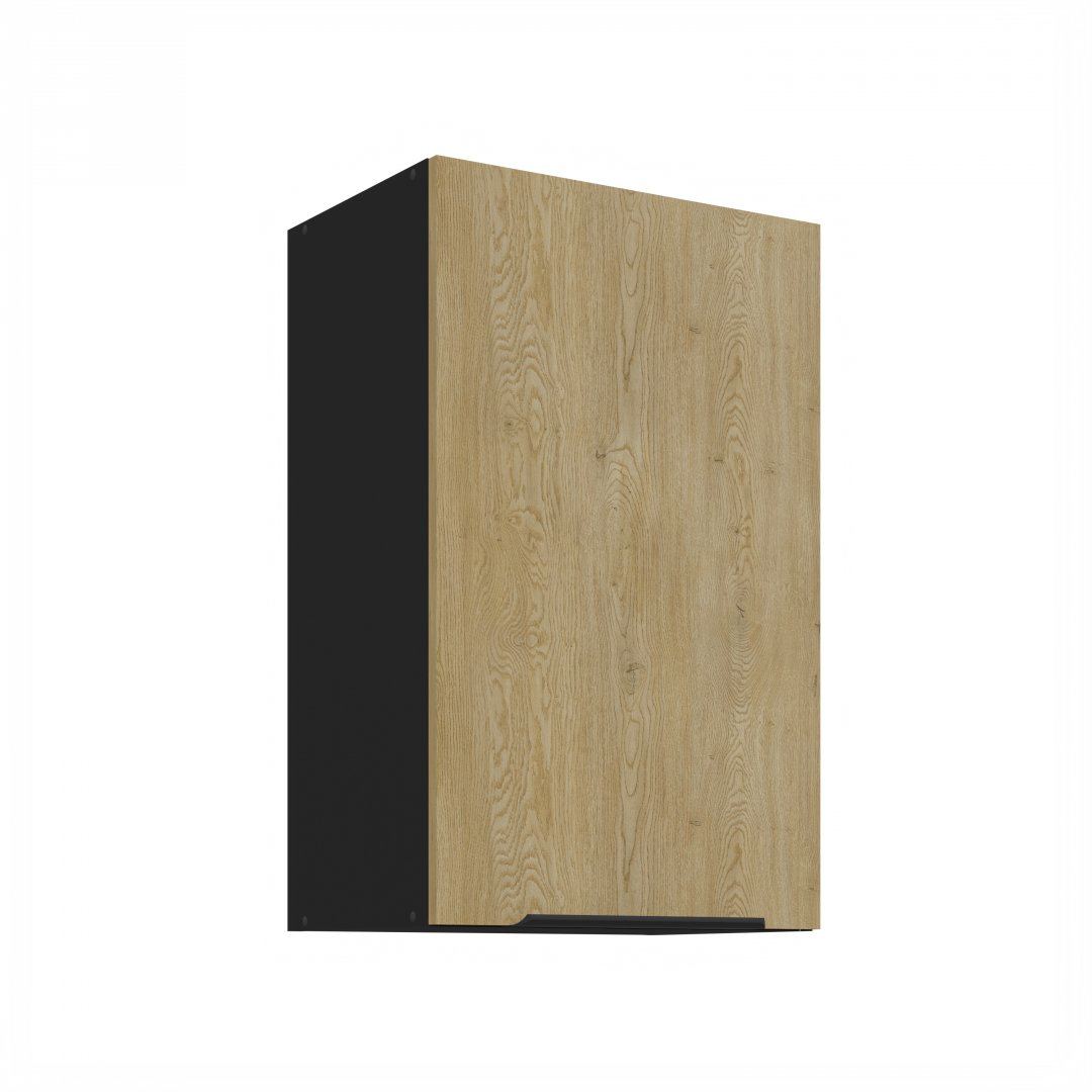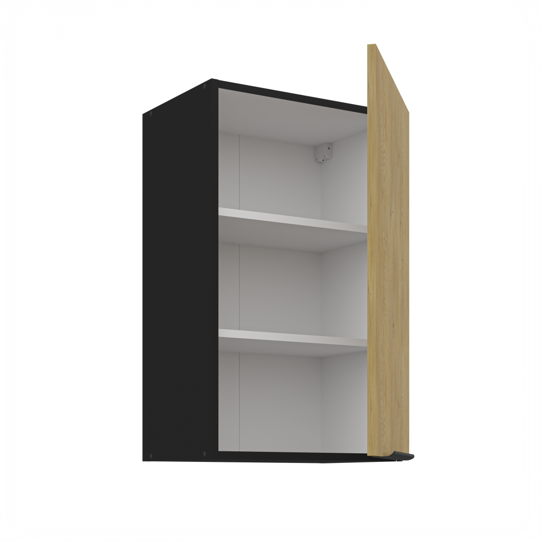 Horní otevírací skříňka ze systému CREMONA - skříňka do kuchyňské linky je uzavíratelná praktickými dvířky se širokými úchyty. Dvířka skříněk jsou provedené v dekoru dub Cremona a u korpusu je na výběr dekor bílý nebo černý.