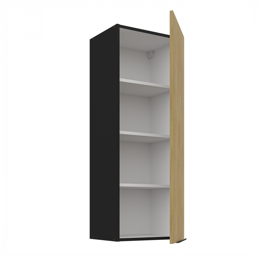Horní otevírací skříňka ze systému CREMONA - skříňka do kuchyňské linky je uzavíratelná praktickými dvířky se širokými úchyty. Dvířka skříněk jsou provedené v dekoru dub Cremona a u korpusu je na výběr dekor bílý nebo černý.