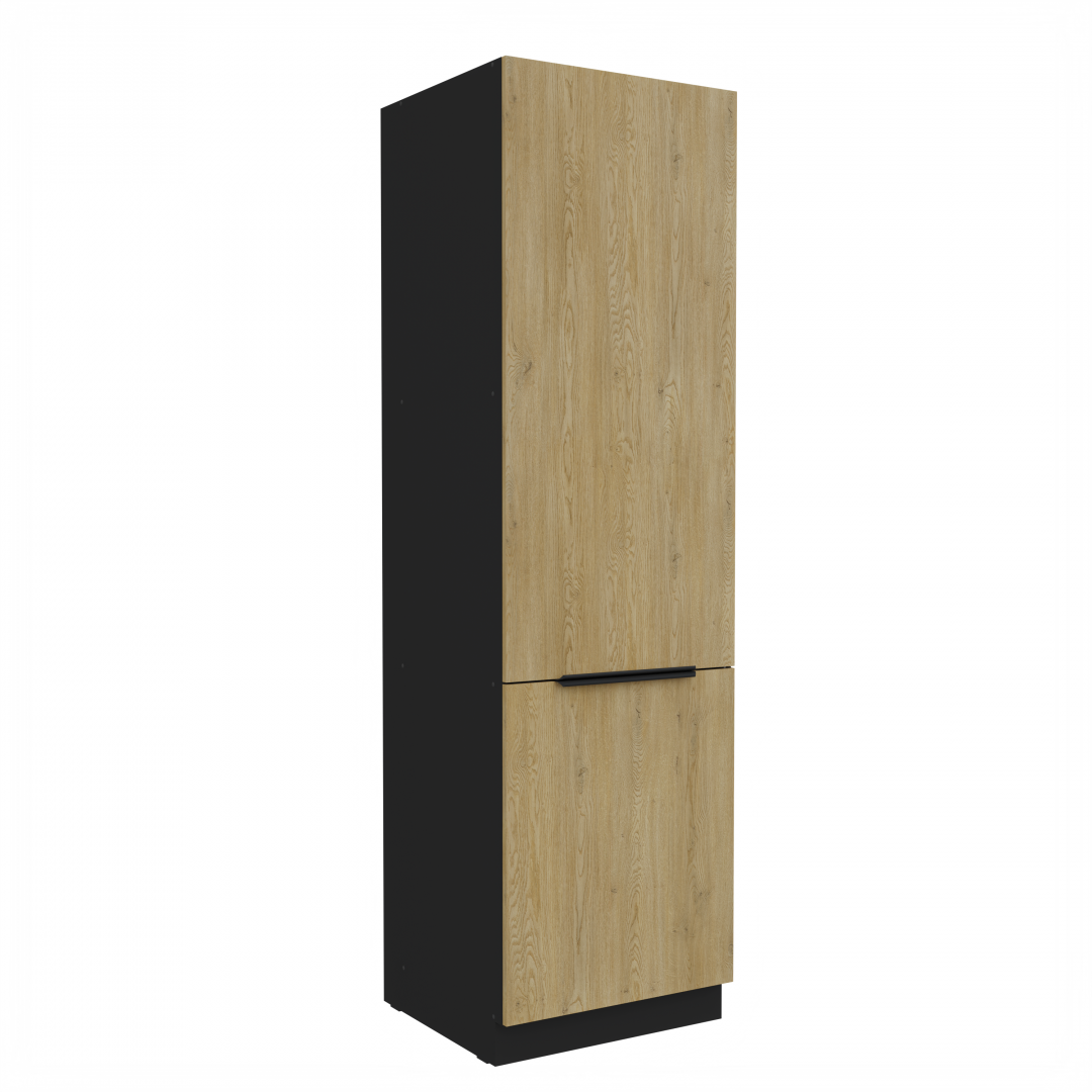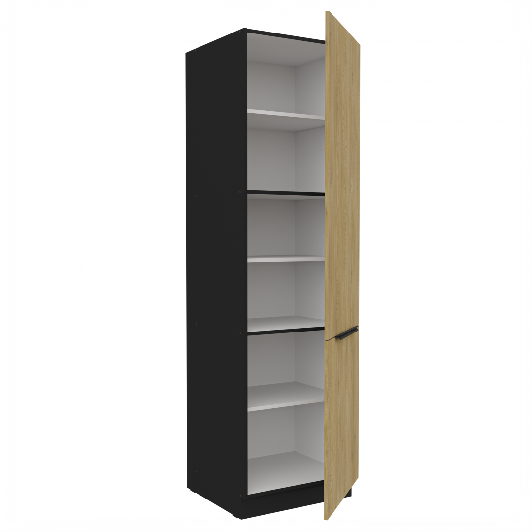 Vysoká potravinová skříň ze systému CREMONA - skříňka do kuchyňské linky je opatřena dvěma prostory s policemi a otevíracími dvířky se širokými úchyty. Dvířka skříněk jsou vyrobeny v dekoru dub Cremona a u korpusu je na výběr dekor bílý nebo černý.