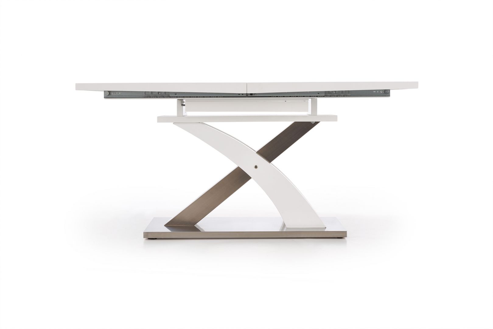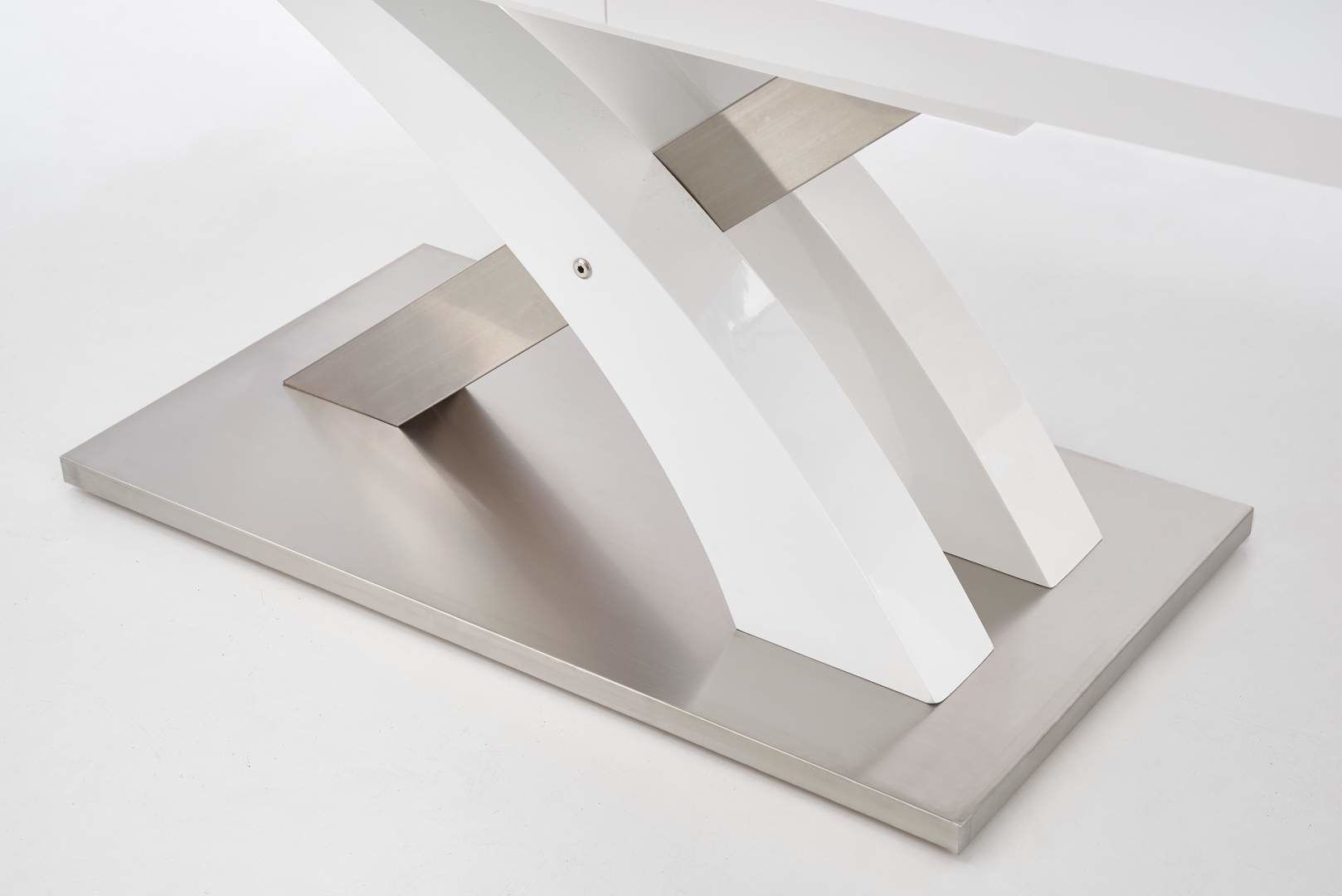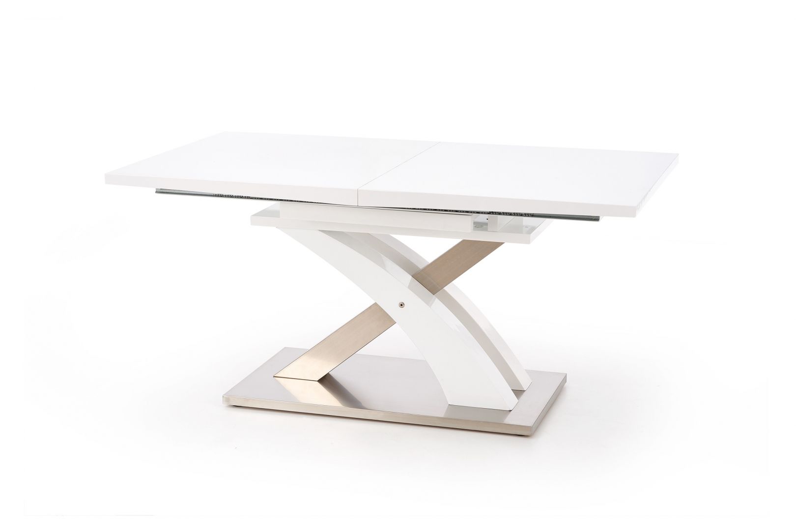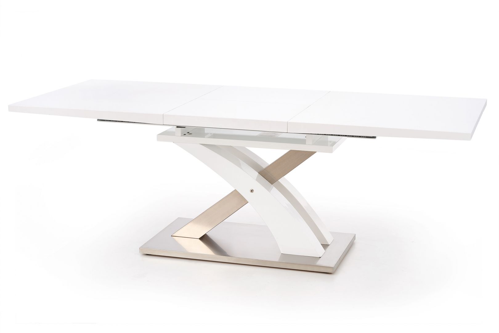 Jídelní stůl SANDOR - je moderní rozkládací jídelní stůl na elegantní podnoži. Stůl je vyrobený z lakované MDF v bílém barevném provedení v lesku a nerezové oceli.