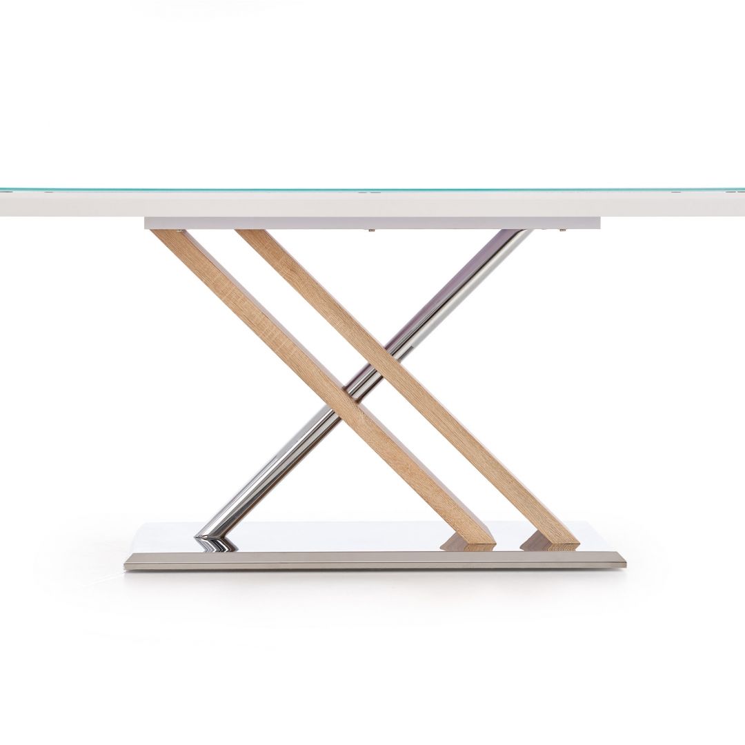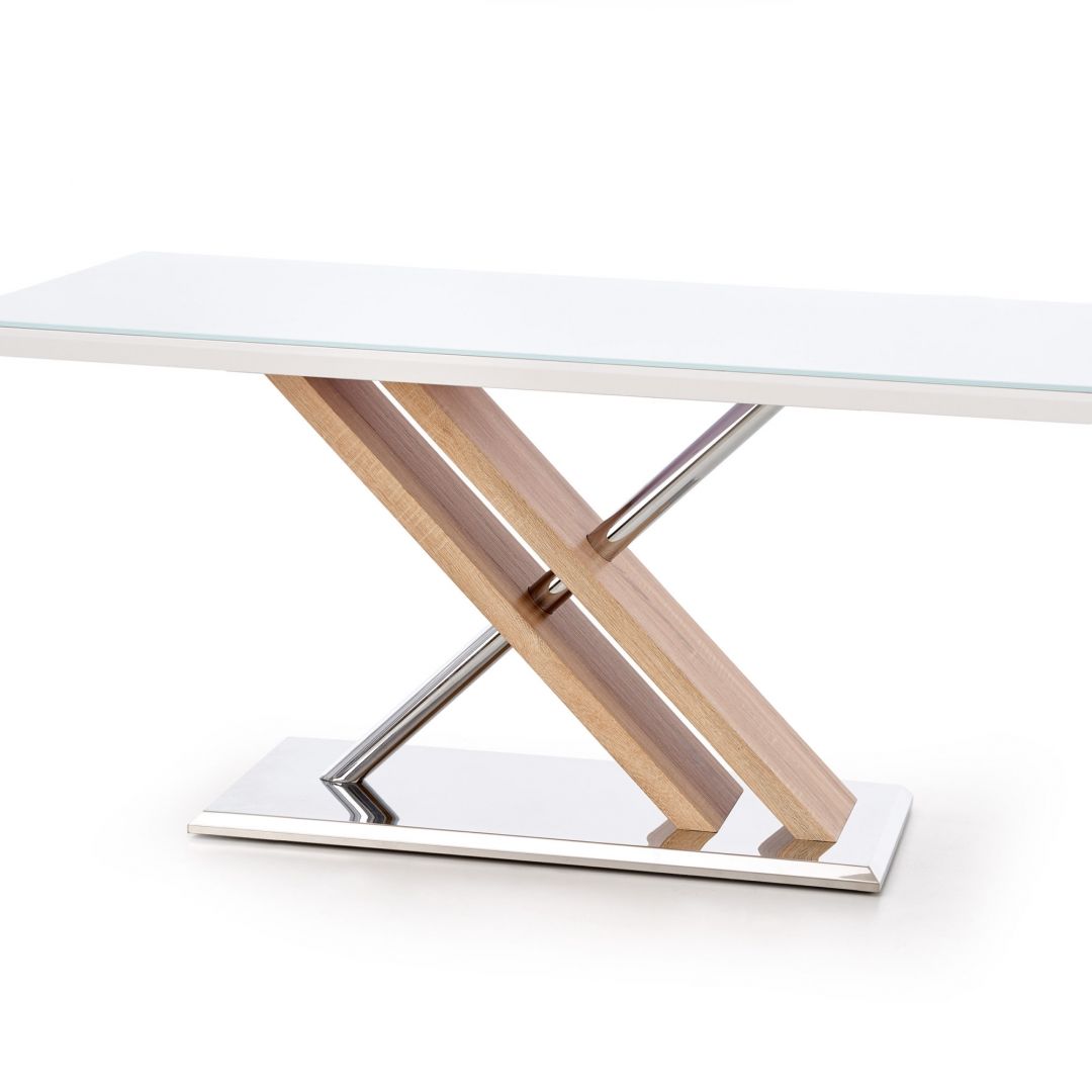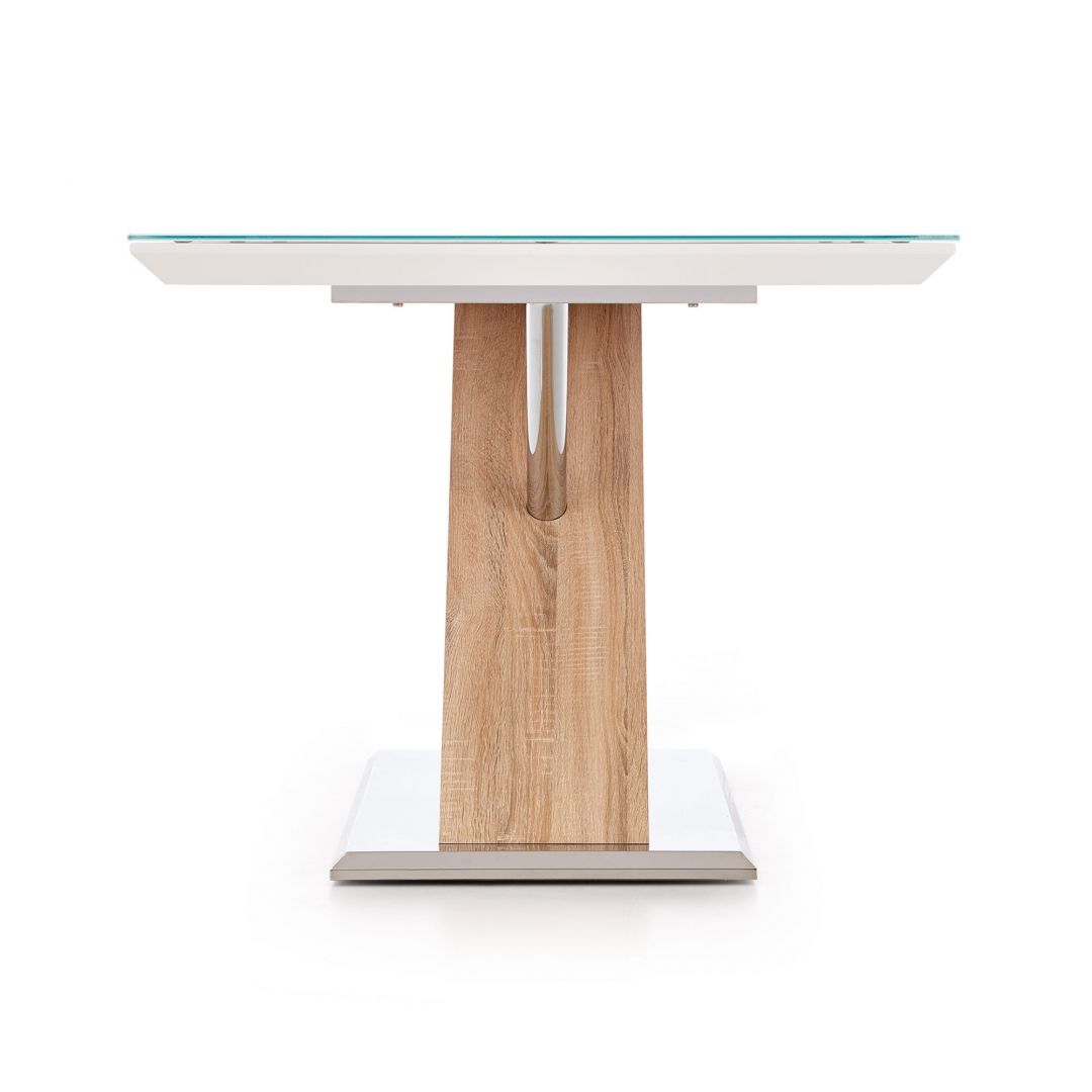 Jídelní stůl NEXUS - je moderní jídelní stůl na elegantní podnoži. Stůl je vyrobený z laminované MDF v dubu sonoma, chromované oceli, bílé lakované MDF a bílém skle.