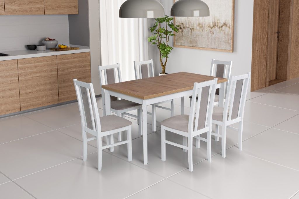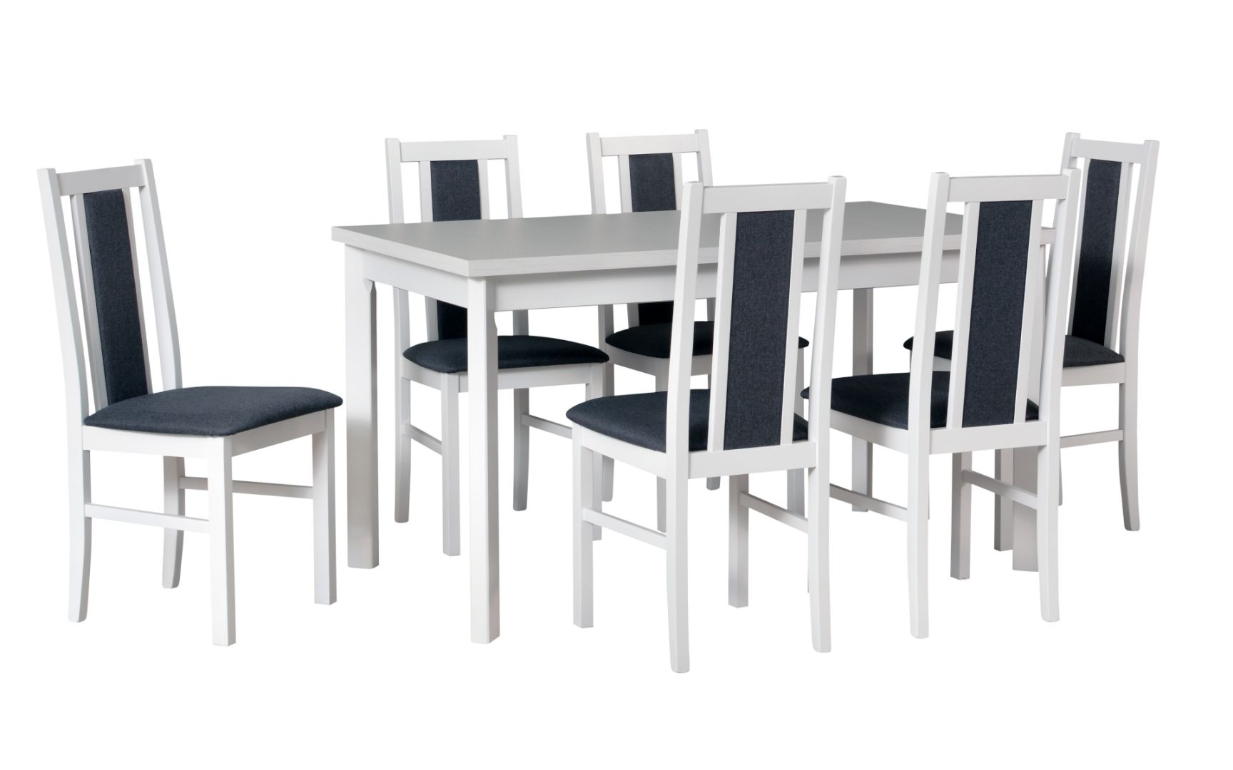 Elegantní jídelní sestava vhodná pro stolování 6 lidí. Jídelní židle z bukového masivu jsou polstrované, samozřejmostí je výběr barvy a struktury potahu. Konstrukce stolu je vyrobena z výběrového bukového masivu a deska stolu je z odolného praktického lamina s ABS hranou. Vysoká kvalita a klasický design jídelních židlí a stolu zaručuje dlouhou životnost.
