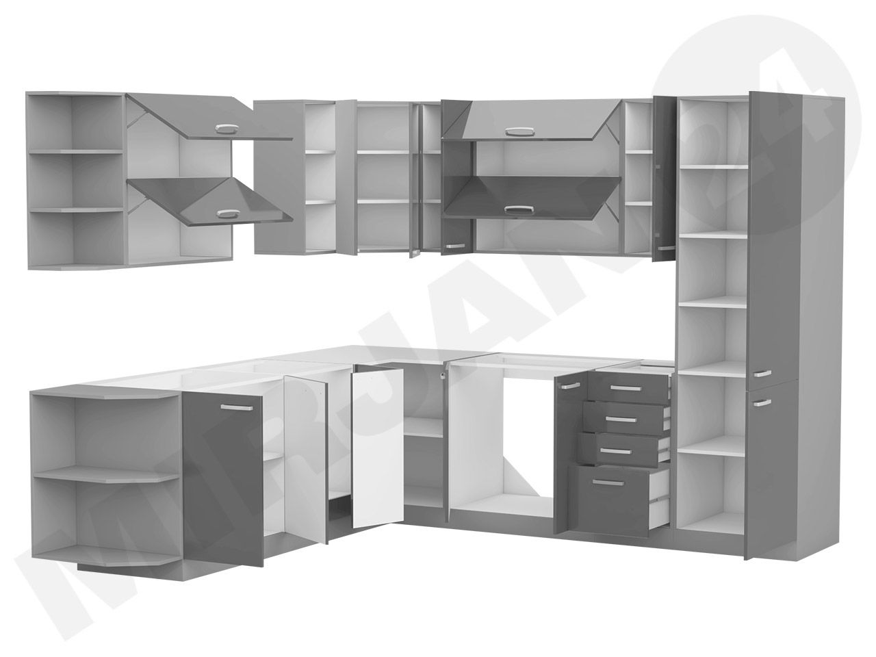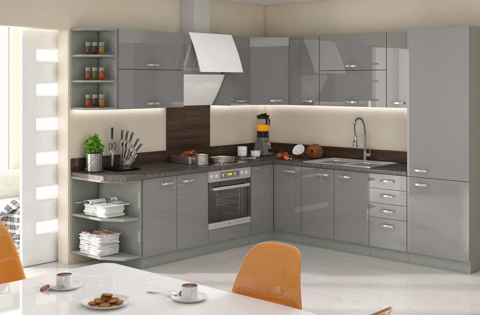 Moderní kuchyňská linka v barevném provedení korpus šedý + dvířka šedý lesk. Kuchyňská linka má atraktivní moderní vzhled je tak ideální volbou pro Vaši kuchyni. Dvířka kuchyňských skříněk nebo šuplíků mají tiché zavírání dvířek. U skříněk s výklopem se dvířka zvedají pomocí plynových pístů. V ceně kuchyňské linky jsou kovové úchyty.