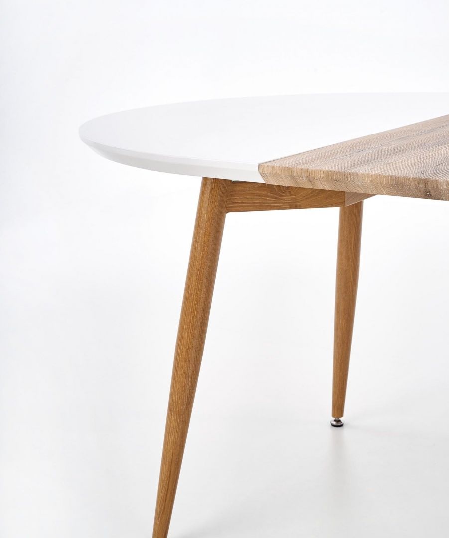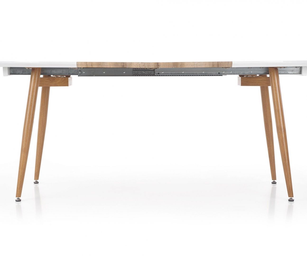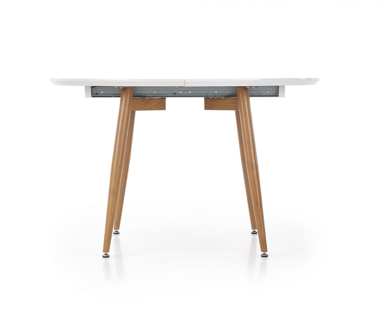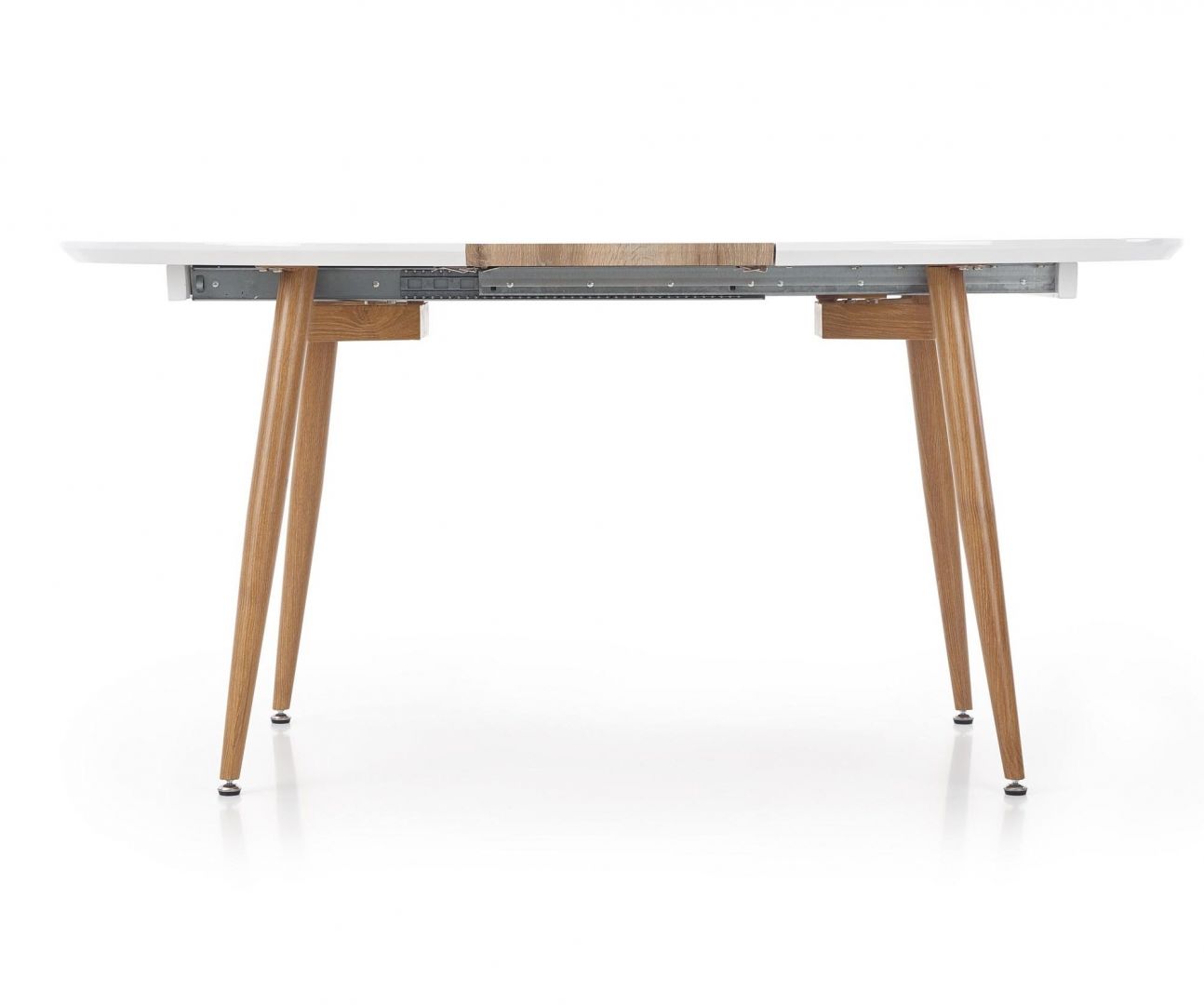 Jídelní stůl EDWARD - je rozkládací jídelní stůl v retro desingu vyrobený v kombinaci lakované desky a designové podnože z masivu v barvě dub.