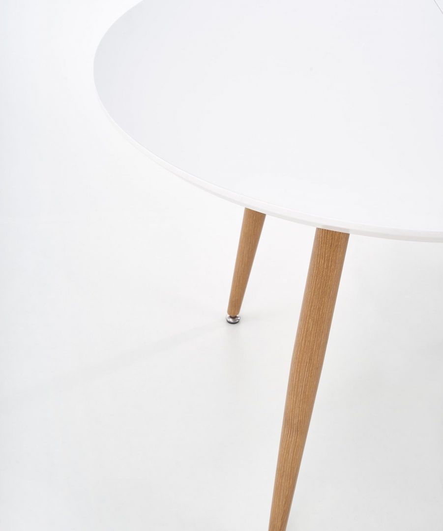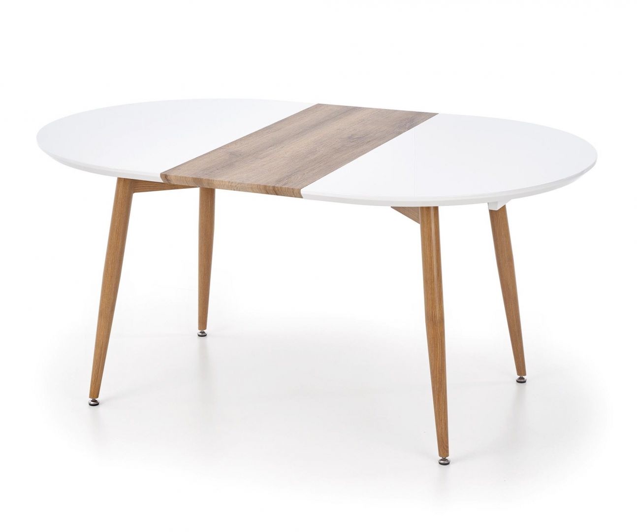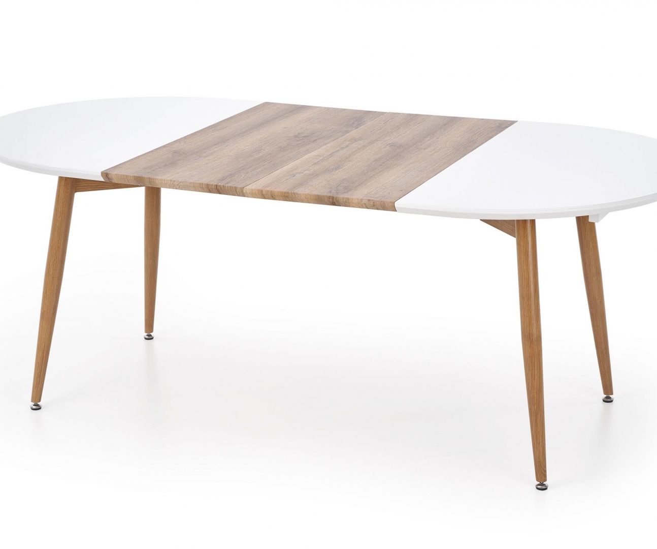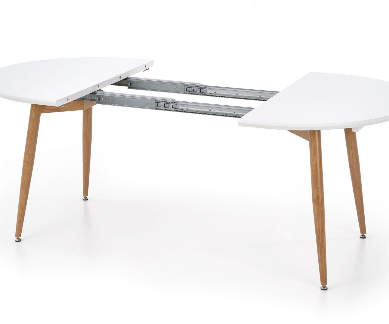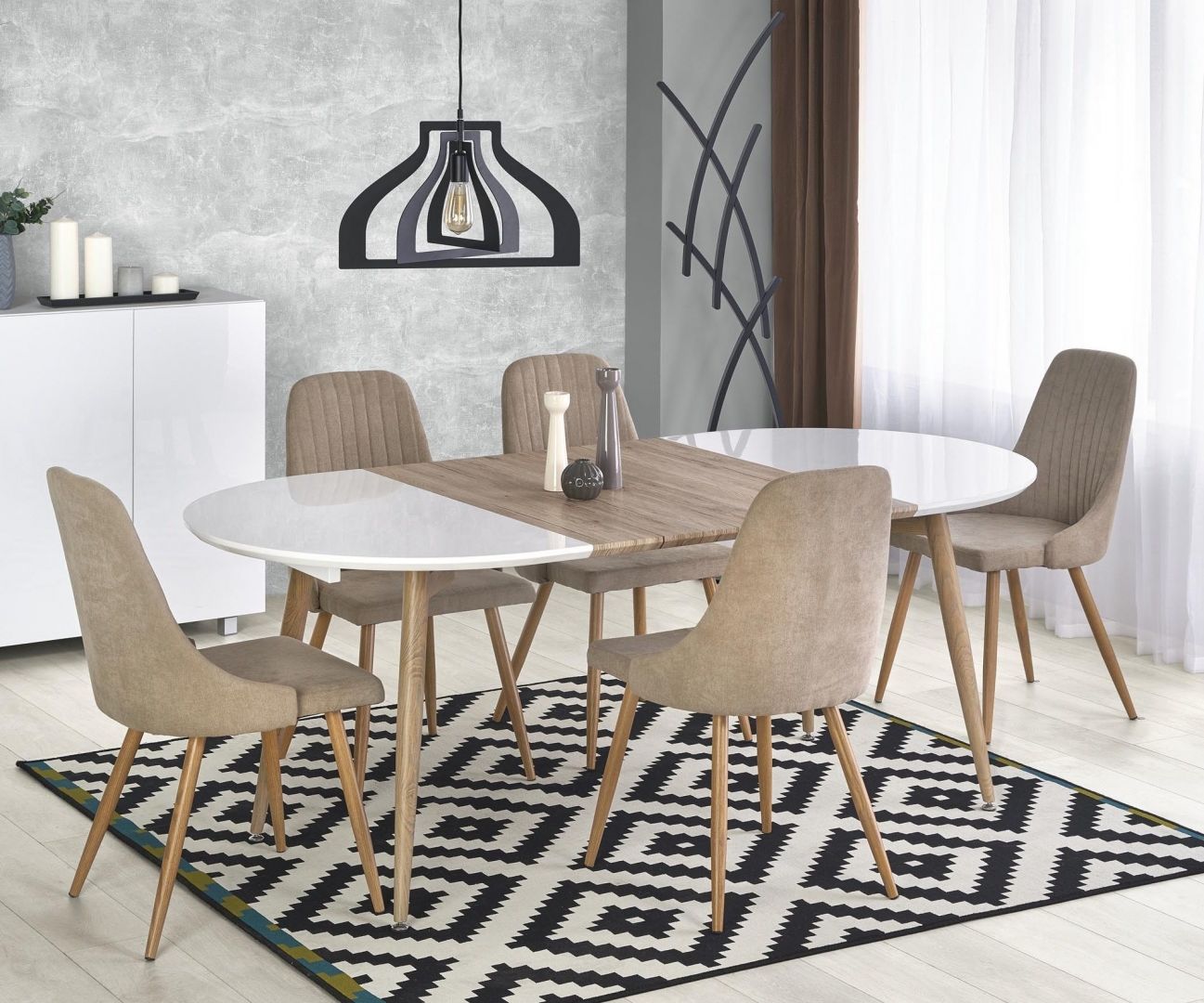 Jídelní stůl EDWARD - je rozkládací jídelní stůl v retro desingu vyrobený v kombinaci lakované desky a designové podnože z masivu v barvě dub.