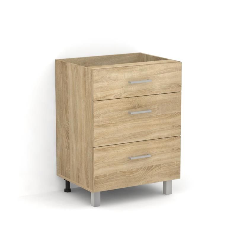 Kuchyňské skříňky jsou na nožkách, vpředu jsou elegantní kovové nožičky a v zadní části jsou nastavitelné nohy z černého plastu. Kuchyňská skříňka je vyrobena z kvalitní laminované DTD desky. Spodní skříňka do kuchyně je uzavíratelná praktickými šuplíky se širokými kovovými úchyty.
