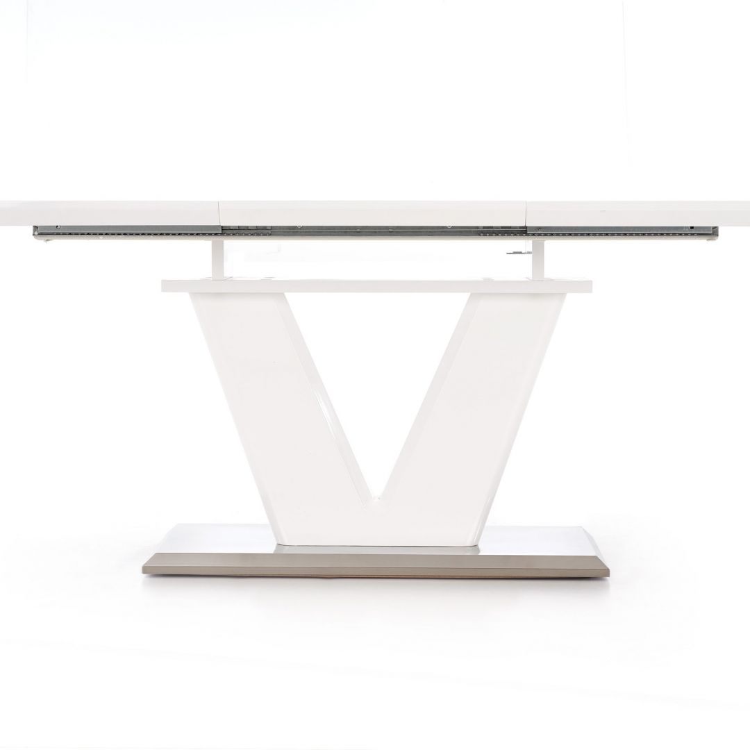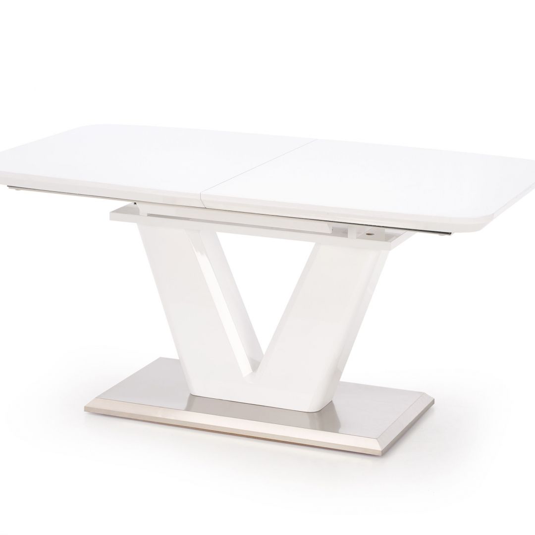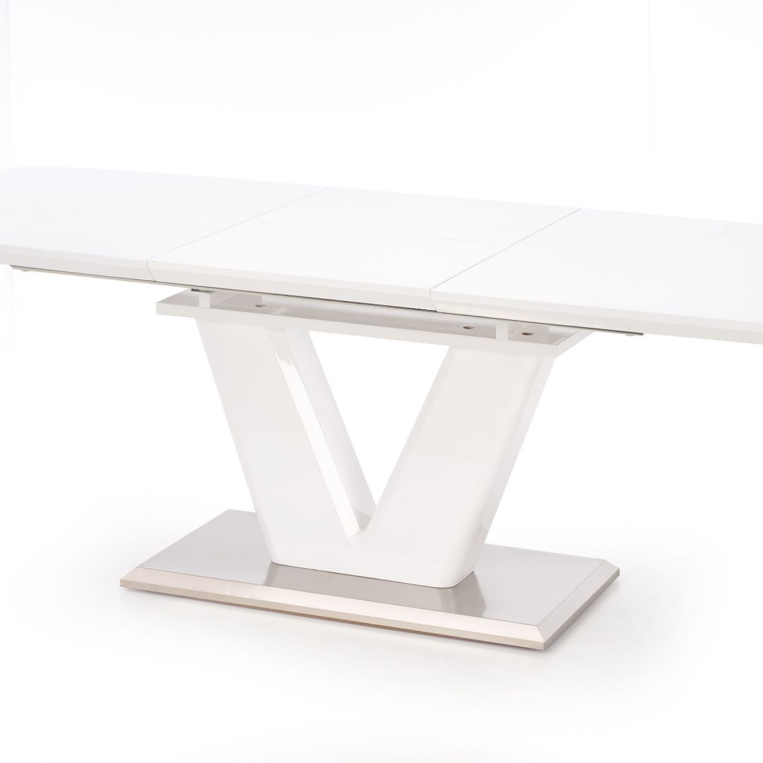 Jídelní stůl MISTRAL - je moderní rozkládací jídelní stůl na elegantní podnoži. Stůl je vyrobený z lakované MDF ve vysokém lesku v bílé barvě a nerezové oceli.