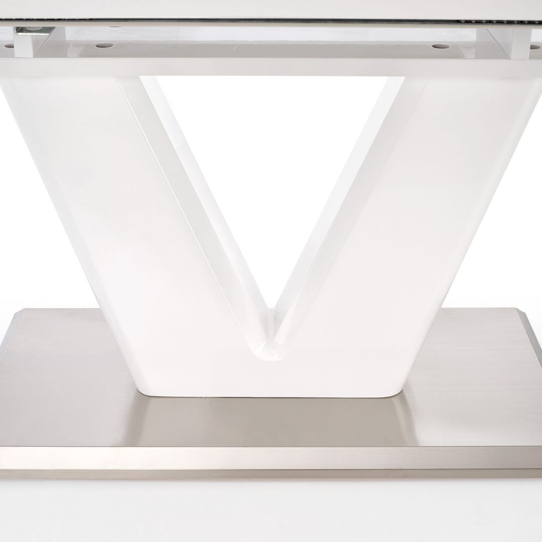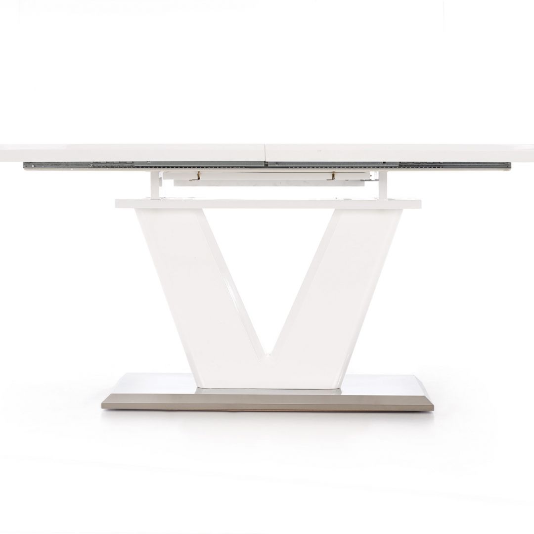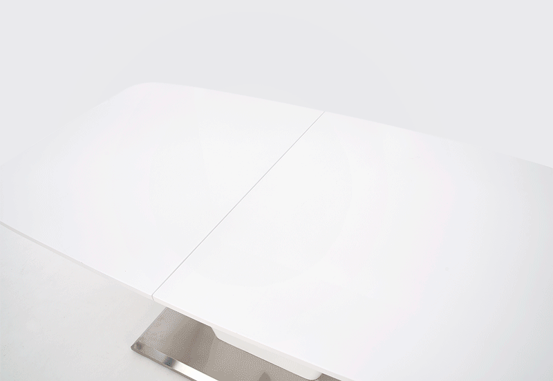 Jídelní stůl MISTRAL - je moderní rozkládací jídelní stůl na elegantní podnoži. Stůl je vyrobený z lakované MDF ve vysokém lesku v bílé barvě a nerezové oceli.