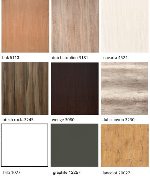 bílá, dub bardolino, wenge, buk, navarra, ořech rockpile, lancelot a dub canyon