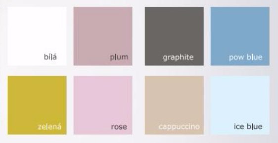 graphite, rose, plum, ice blue, pow blue, zelená a cappuccino