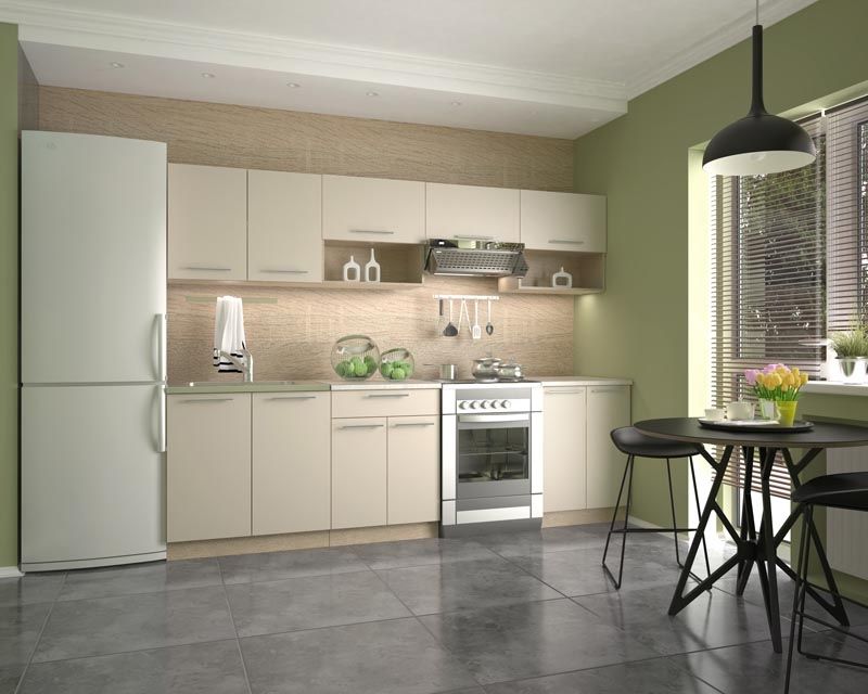 Kuchyňská linka VIOLA je moderní kuchyňská linka v kombinaci dubu sonoma korpusu a dvířek v barvě vanila, pracovní deska je v béžové barvě. Šířka linky je 260 cm.