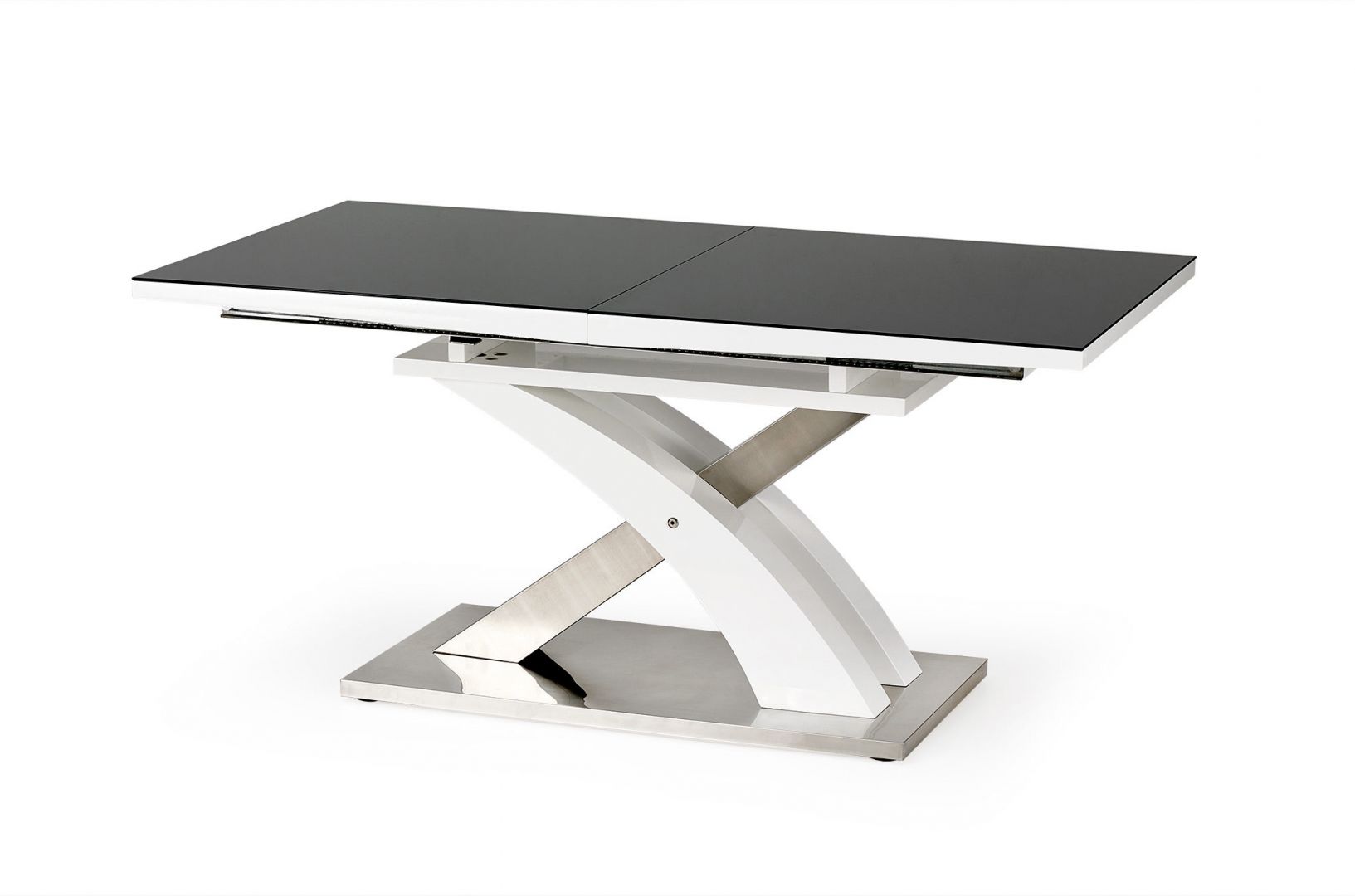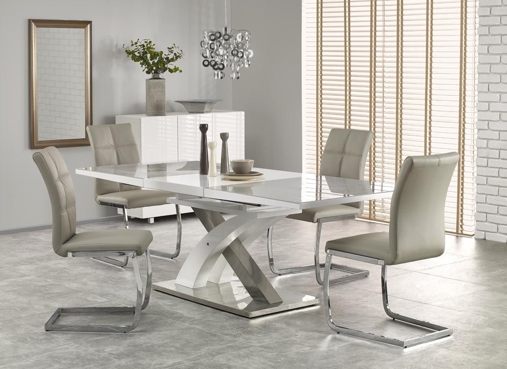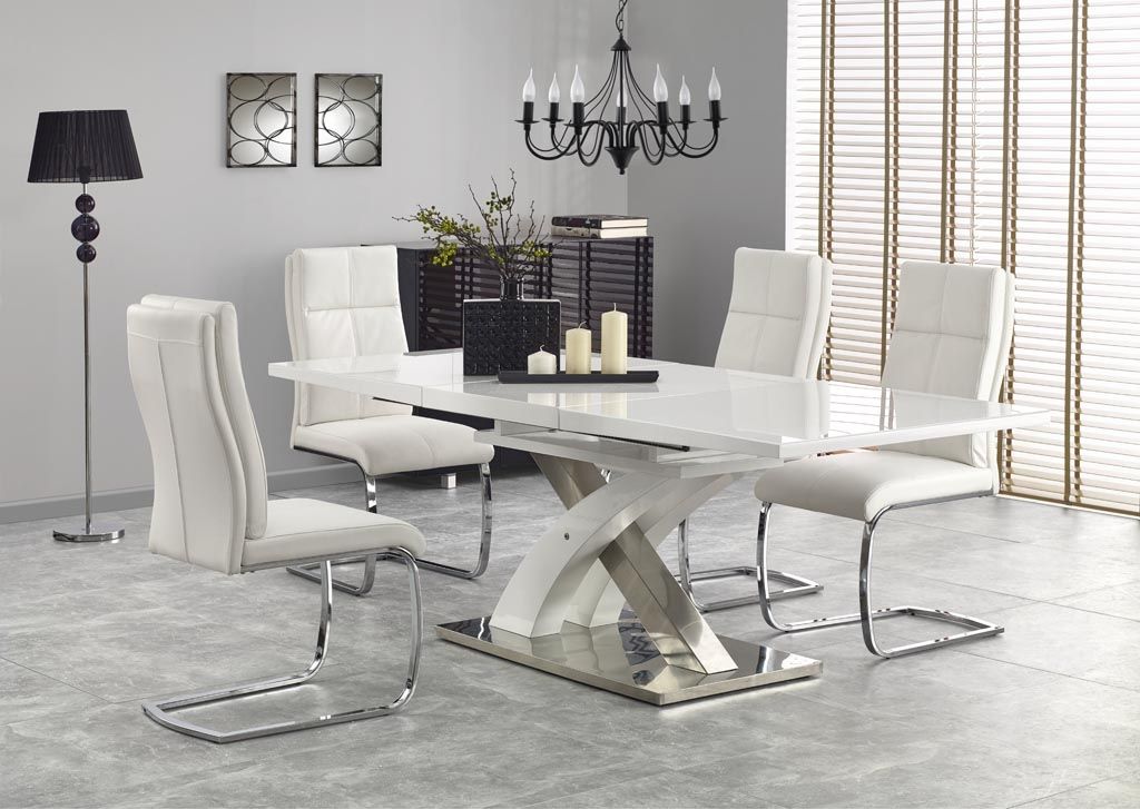 Jídelní stůl SANDOR 2- je moderní rozkládací jídelní stůl na elegantní podnoží. Stůl je vyrobený z laminované lesklé MDF v barvě bílá, šedá, černá a nerezové oceli.