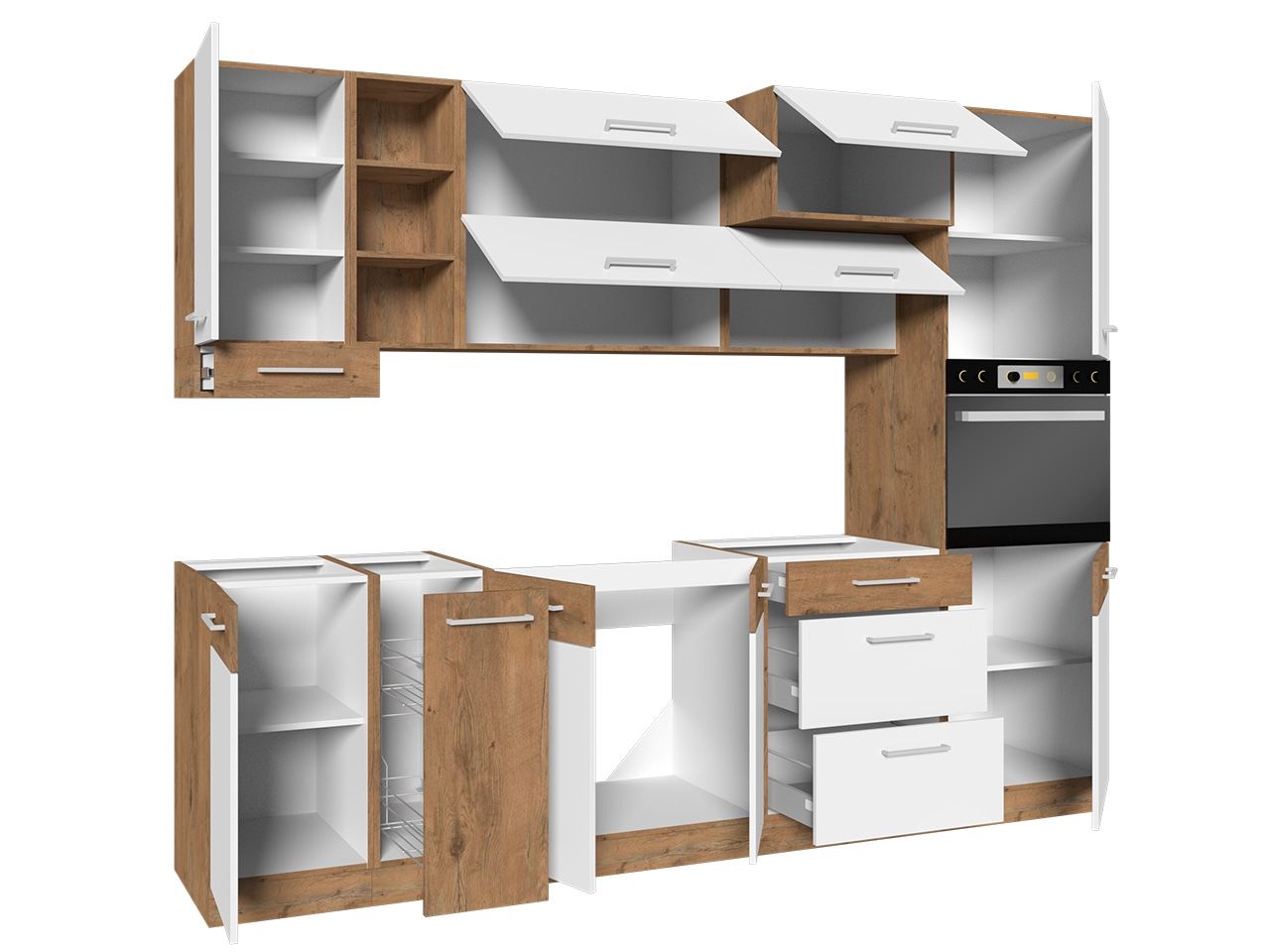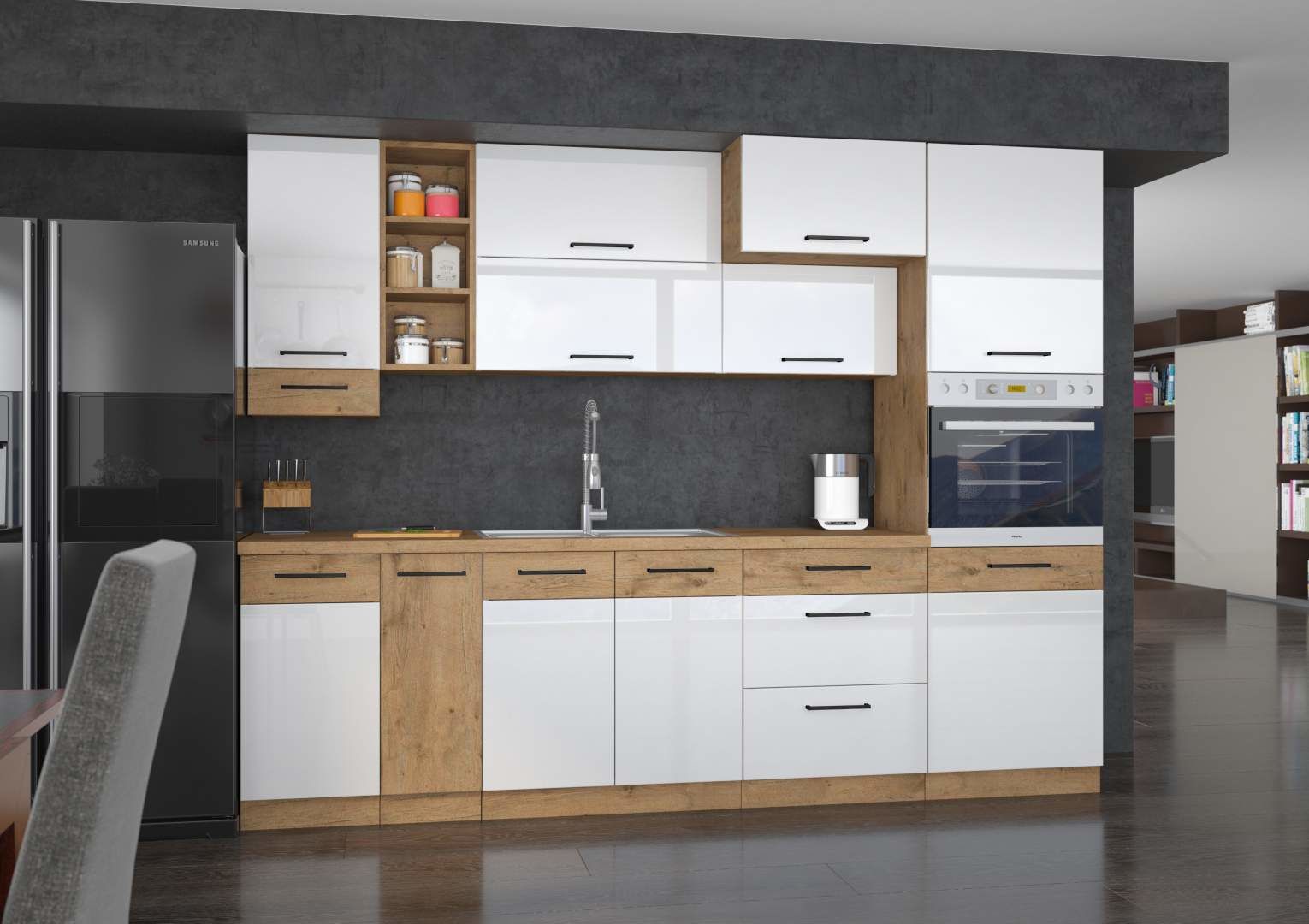 Moderní kuchyňská linka v barevném provedení korpus Dub Lancelot + dvířka Bílý lesk. Kuchyňská linka má atraktivní moderní vzhled je tak ideální volbou pro Vaši kuchyni. Dvířka kuchyňských skříněk nebo šuplíků mají tiché zavírání dvířek. U skříněk s výklopem se dvířka zvedají pomocí plynových pístů. V ceně kuchyňské linky jsou plastové úchyty, které je možnost za příplatek nahradit kovovými. U šuplíků velikosti 60 a 80 cm jsou boky šuplíků kovové.