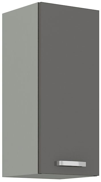 Horní otevírací plná skříňka ze systému GREI - skříňka do kuchyňské linky je uzavíratelná praktickými dvířky se širokým úchytem. Dvířka skříněk jsou provedené v moderním šedém lesku. Dvířka skříňky mají tichý doraz.