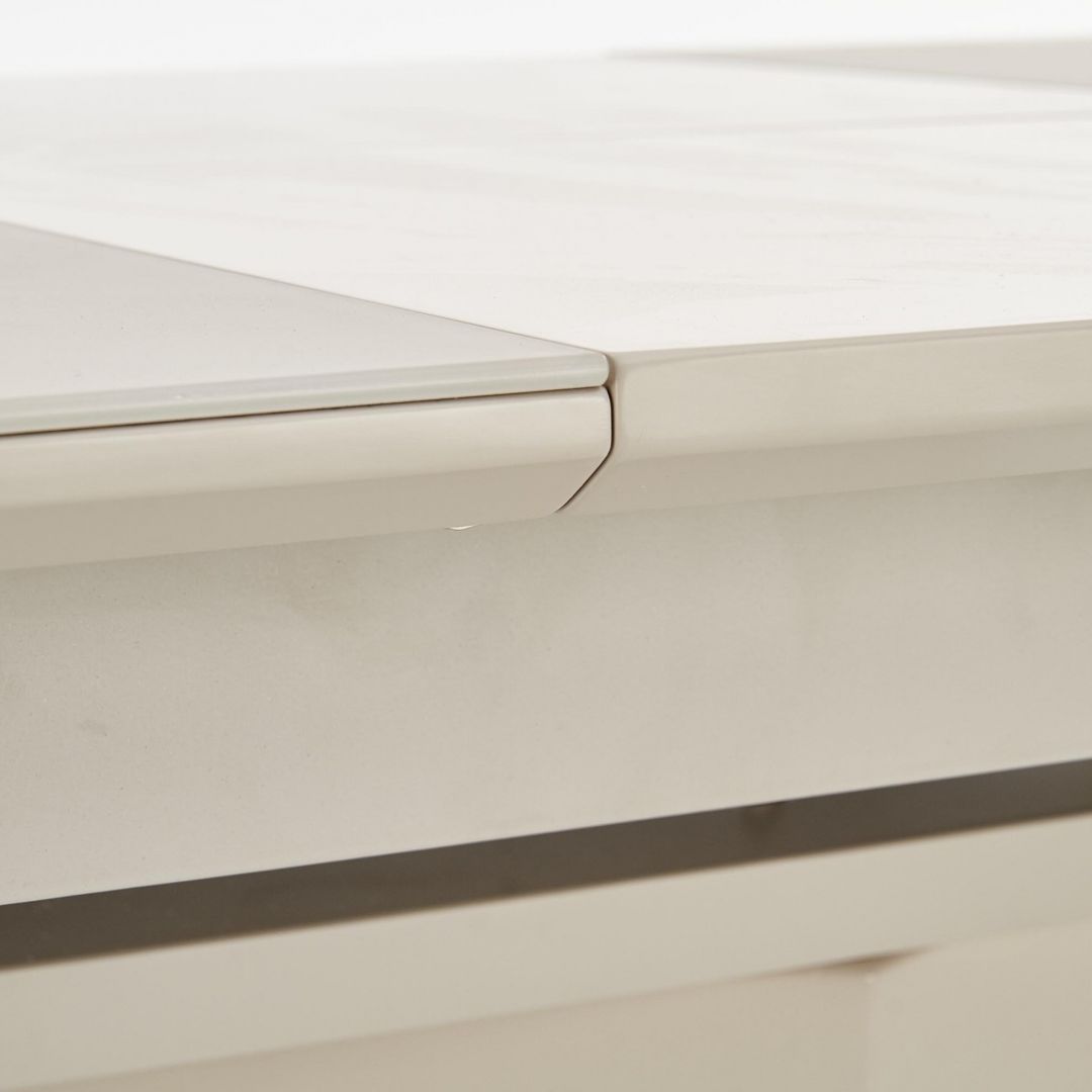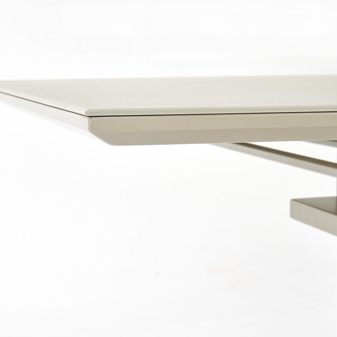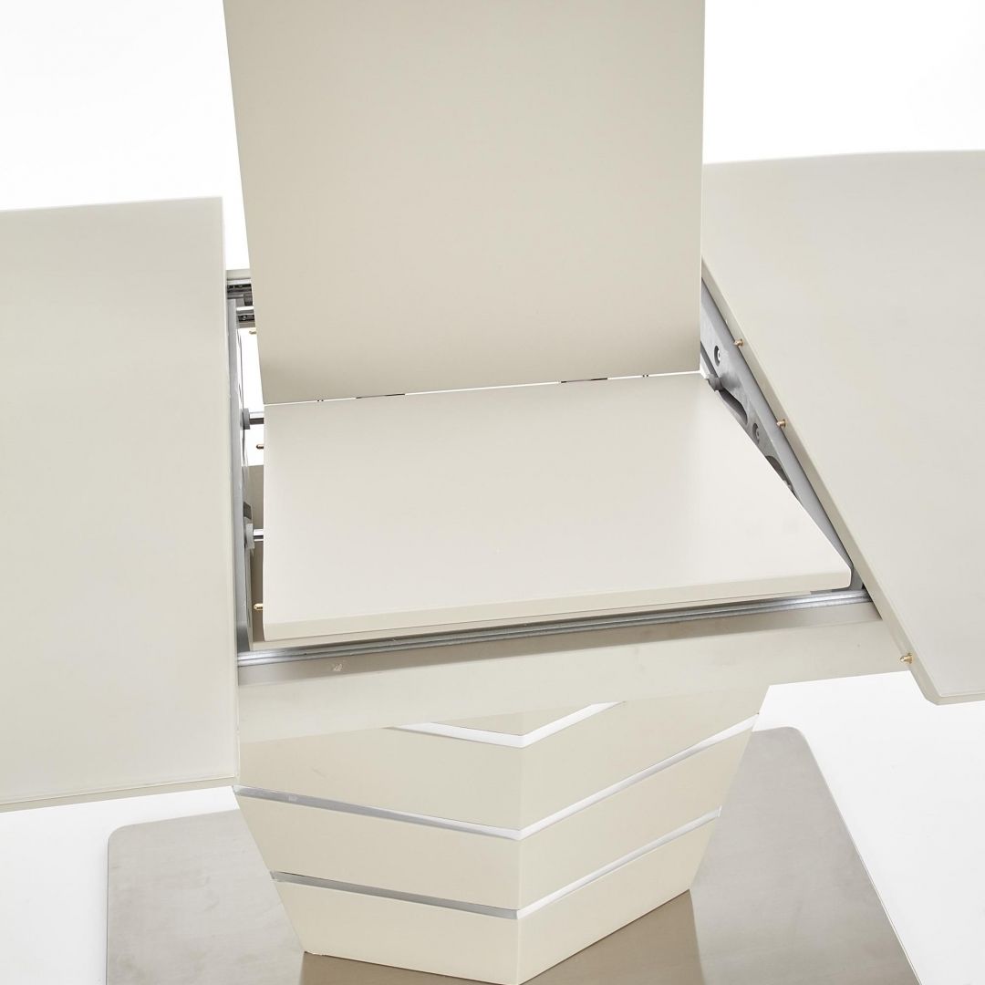 Jídelní stůl SORENTO - je stylový rozkládací jídelní stůl na elegantní podnoži. Stůl je vyrobený z matné MDF v dekoru champagne, nerezové oceli a sklem průhledné barvy.