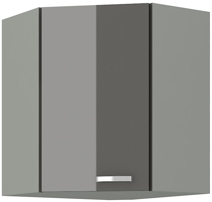 Horní rohová skříňka ze systému GREI- rohová skříňka do kuchyňské linky je uzavíratelná praktickými dvířky se širokými úchyty. Dvířka skříněk jsou provedené v moderním šedém lesku.