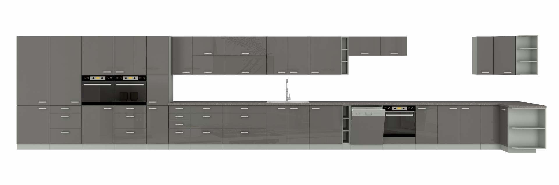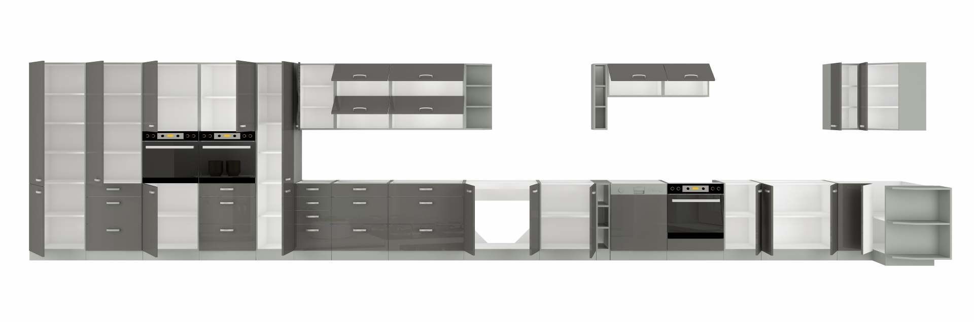 Moderní kuchyňská linka v barevném provedení korpus šedý / dvířka šedý lesk. Kuchyňská linka má atraktivní moderní vzhled je tak ideální volbou pro Vaši kuchyni. Dvířka kuchyňských skříněk nebo šuplíků mají tiché zavírání dvířek. U skříněk s výklopem se dvířka zvedají pomocí plynových pístů. V ceně kuchyňské linky jsou kovové úchyty. Skříňky kuchyňské linky jsou opatřeny tichým dorazem.