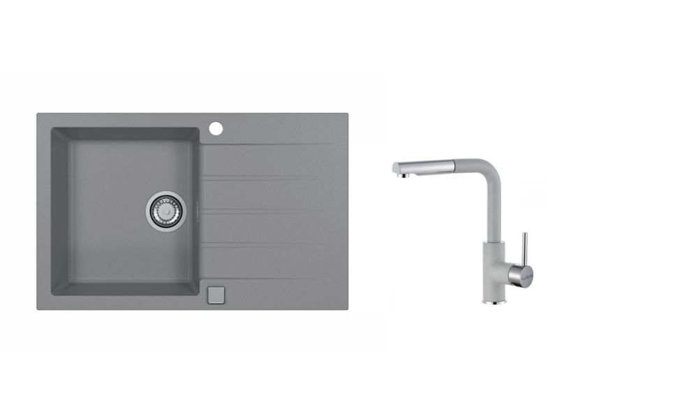 Vestavěný dřez, univerzál. Provedení : granitový dřez s odkapem Vnější rozměr: 790 x 500 mm Rozměr vaničky: 375 x 425 x 200 mm Exentrický sítkový ventil 3 1/2 s přepadem, sifon pro úsporu místa s odbočkou na myčku Úchyty a těsnění pro upevnění dřezu v balení S otvorem pro baterii Návod pro instalaci v obrázcích na obale Instalace do skříňky o šířce 500 mm Váha: 14 kg Rozměr balení (mm): 904x598x263 Baterie Siros Vysokotlaká baterie otočné ramínko rozměr: 206 x 297 mm provedení: chrom/ barevný nástřik Granital / vytahovací koncovka Váha: 2,5 Kg