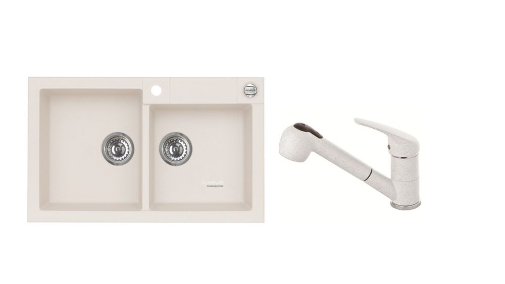 Vestavěný dřez, univerzál. Provedení : granitový dřez Vnější rozměr: 780 x 480 mm Rozměr vaničky: 340 x 400 x 180 mm 340 x 350 x 180 mm Exentrický sítkový ventil 3 1/2 s přepadem, sifon pro úsporu místa s odbočkou na myčku Úchyty a těsnění pro upevnění dřezu v balení S otvorem pro baterii Návod pro instalaci v obrázcích na obale Instalace do skříňky o šířce 800 mm Váha: 21,45 kg Rozměr balení (mm): 865x560x220 Baterie AM 20 Vysokotlaká baterie otočné ramínko vytahovací sprška rozměr:198 x 150 mm provedení: barevný nástřik