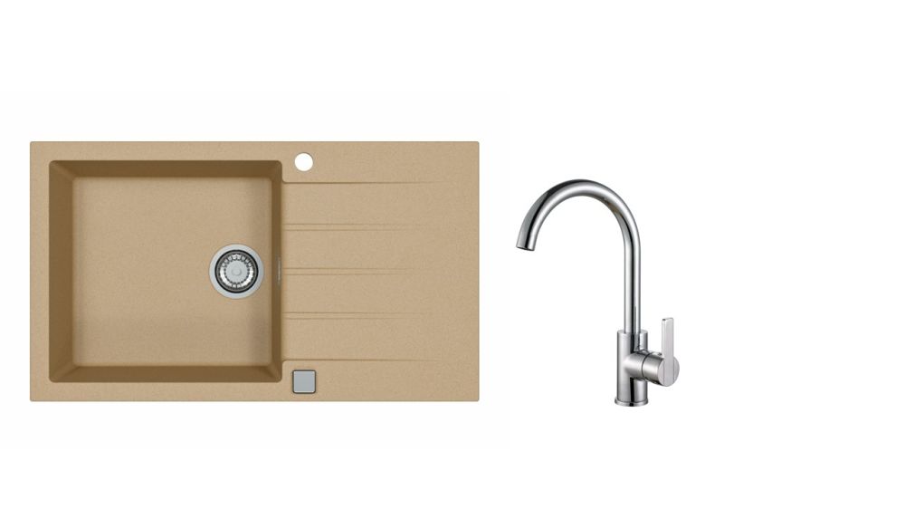 Vestavěný dřez, univerzál. Provedení : granitový dřez s odkapem Vnější rozměr: 860 x 500 mm Rozměr vaničky: 445 x 425 x 200 mm Excentrický sítkový ventil 3 1/2 s přepadem, sifon pro úsporu místa s odbočkou na myčku Úchyty a těsnění pro upevnění dřezu v balení S otvorem pro baterii Návod pro instalaci v obrázcích na obale Instalace do skříňky o šířce 600 mm Váha: 15,2 kg Rozměr balení (mm): 974x598x263 Baterie Tonia Chrom Materiál: CHROM Vysokotlaká, otočná Rozměry: 174x320 mm Váha: 1,15 Kg