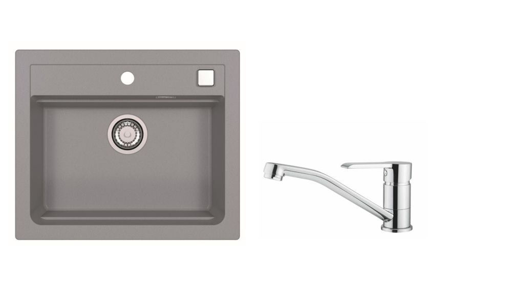 Vestavěný dřez, univerzál. Provedení : granitový dřez s odkapem Vnější rozměr: 590 x 500 mm Rozměr vaničky: 510 x 340 x 195 mm Exentrický sítkový ventil 3 1/2 s přepadem, sifon pro úsporu místa s odbočkou na myčku Úchyty a těsnění pro upevnění dřezu v balení S otvorem pro baterii Předfrézované dva otvory Návod pro instalaci v obrázcích na obale Instalace do skříňky při montáži: I- o šířce 600 mm, U- o šířce 800 mm Váha: 11,7 kg Rozměry balení (mm): 714x598x263 Baterie Ruta Stojánková baterie Otočné ramínko Rozměr: 215x328 mm Provedení chrom
