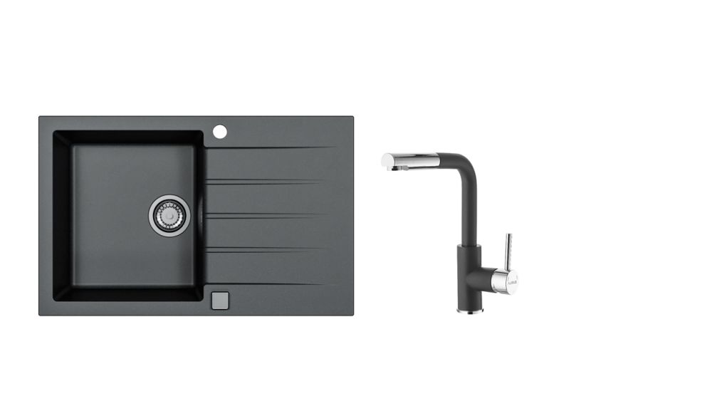 Vestavěný dřez, univerzál. Provedení : granitový dřez s odkapem Vnější rozměr: 790 x 500 mm Rozměr vaničky: 375 x 425 x 200 mm Exentrický sítkový ventil 3 1/2 s přepadem, sifon pro úsporu místa s odbočkou na myčku Úchyty a těsnění pro upevnění dřezu v balení S otvorem pro baterii Návod pro instalaci v obrázcích na obale Instalace do skříňky o šířce 500 mm Váha: 14 kg Rozměr balení (mm): 904x598x263 Baterie Siros Vysokotlaká baterie otočné ramínko rozměr: 206 x 297 mm provedení: chrom/ barevný nástřik Granital / vytahovací koncovka Váha: 2,5 Kg