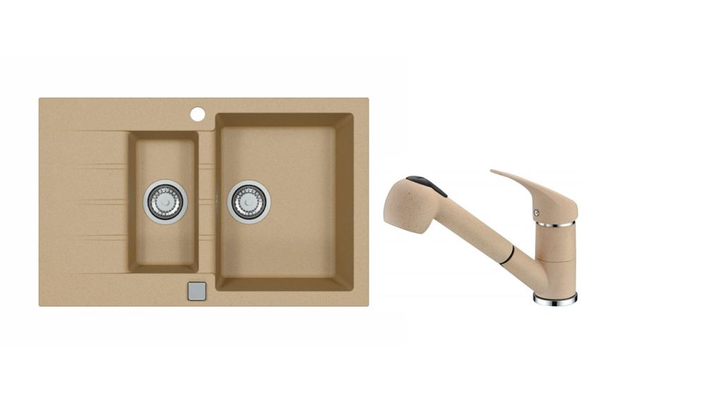 Vestavěný dřez, univerzál. Provedení : granitový dřez s odkapem Vnější rozměr: 790 x 500 mm Rozměr vaničky: 330 x 425 x 200 mm Rozměr vaničky: 170 x 340 x 140 mm Exentrický sítkový ventil 3 1/2 s přepadem, sifon pro úsporu místa s odbočkou na myčku Úchyty a těsnění pro upevnění dřezu v balení S otvorem pro baterii Návod pro instalaci v obrázcích na obale Instalace do skříňky o šířce 600 mm Váha: 15,6 kg Rozměry balení (mm): 904x598x263 Baterie AM 20 Vysokotlaká baterie otočné ramínko vytahovací sprška rozměr:198 x 150 mm provedení: barevný nástřik