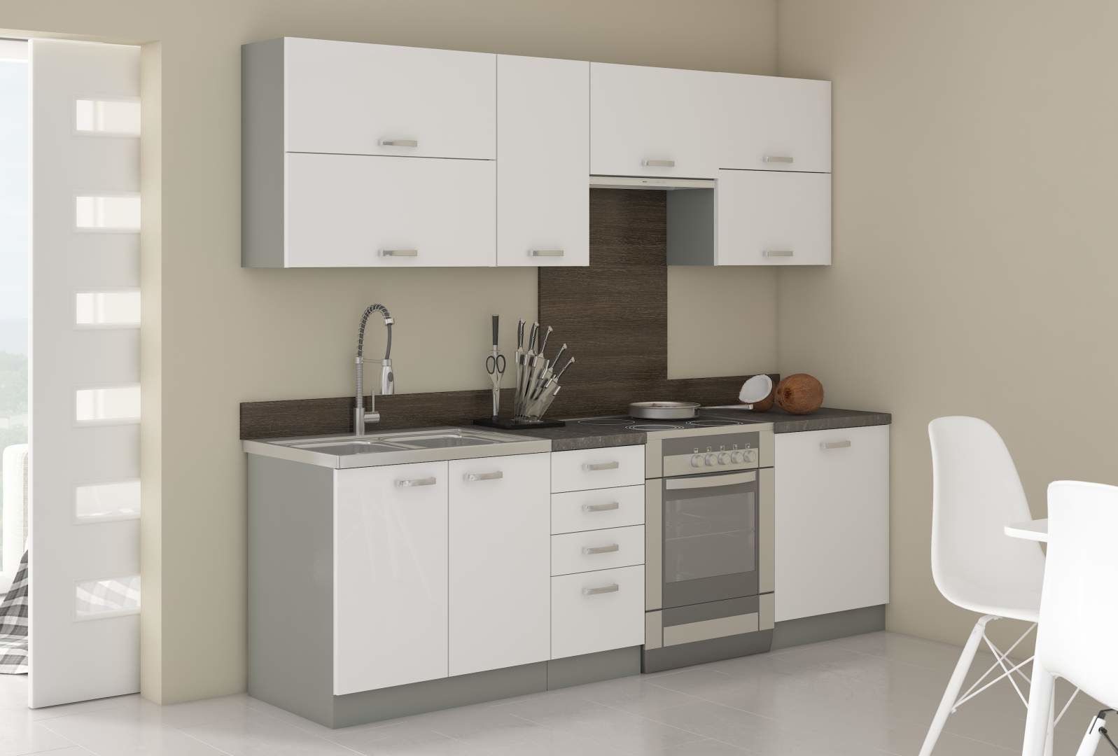 Moderní kuchyňská linka v barevném provedení korpus šedý / dvířka bílý lesk. Kuchyňská linka má atraktivní moderní vzhled je tak ideální volbou pro Vaši kuchyni. Dvířka kuchyňských skříněk nebo šuplíků mají tiché zavírání dvířek. U skříněk s výklopem se dvířka zvedají pomocí plynových pístů. V ceně kuchyňské linky jsou kovové úchyty. U šuplíků velikosti 60 a 80 cm jsou boky šuplíků kovové. Skříňky kuchyňské linky jsou opatřeny tichým dorazem.