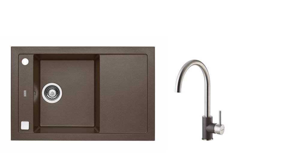Vestavěný nebo dřez se spodní montáží, univerzál. Provedení : granitový dřez Vnější rozměr: 760x500 mm Rozměr vaničky: 347x420x200 mm Excentrický sítkový ventil 3 1/2 s přepadem, sifon pro úsporu místa s odbočkou na myčku. Úchyty a těsnění pro upevnění dřezu v balení S otvorem pro baterii Předfrézovaný třetí otvor pro dávkovač saponátů Návod pro instalaci v obrázcích na obale Instalace do skříňky o šířce u montáže I: 500 mm U: 800 mm Váha: 17,5 kg Rozměr balení (mm): 860x620x265 Elza Vysokotlaká baterie otočné ramínko rozměr:216 x 351 mm provedení: barevný nástřik