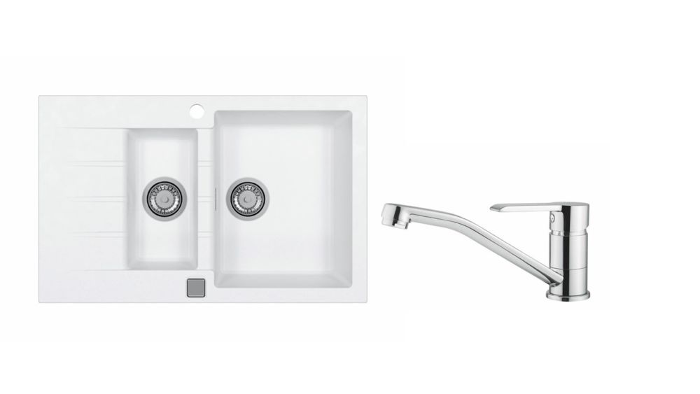 Vestavěný dřez, univerzál. Provedení : granitový dřez s odkapem Vnější rozměr: 790 x 500 mm Rozměr vaničky: 330 x 425 x 200 mm Rozměr vaničky: 170 x 340 x 140 mm Exentrický sítkový ventil 3 1/2 s přepadem, sifon pro úsporu místa s odbočkou na myčku Úchyty a těsnění pro upevnění dřezu v balení S otvorem pro baterii Návod pro instalaci v obrázcích na obale Instalace do skříňky o šířce 600 mm Váha: 15,6 kg Rozměry balení (mm): 904x598x263 Baterie Ruta Stojánková baterie Otočné ramínko Rozměr: 215x328 mm Provedení chrom