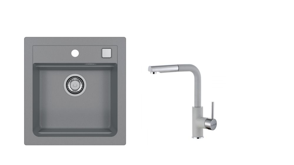 Vestavěný dřez, univerzál. Provedení : granitový dřez Vnější rozměr: 470 x 500 mm Rozměr vaničky: 390 x 340 x 195 mm Exentrický sítkový ventil 3 1/2 s přepadem, sifon pro úsporu místa s odbočkou na myčku Úchyty a těsnění pro upevnění dřezu v balení S otvorem pro baterii Předfrézované dva otvory Návod pro instalaci v obrázcích na obale Instalace do skříňky při montáži: I- o šířce 450 mm, U- o šířce 600 mm Váha: 9,7 kg Rozměr balení (mm): 598x584x263 Vysokotlaká baterie otočné ramínko vytahovací sprška rozměr:206 x 268 mm provedení: barevný nástřik
