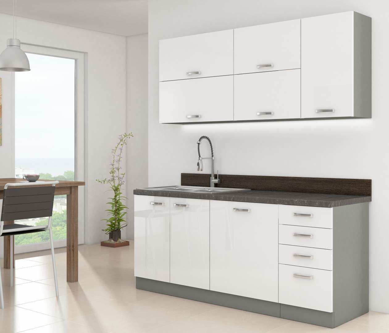 Kuchyňská linka BIANCA - vaření je radost, zábava a společné vzpomínky. Kvalitní kuchyňská linka z MDF s dvířky v lesku vám zpříjemní chvilky strávené ve vaší kuchyni. Velikost kuchyňské linky lze sestavit 180,200, 260 a déle.