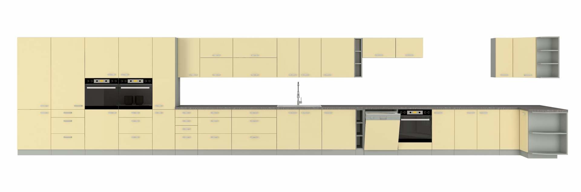 Vysoká skříň na vestavnou troubu ze systému CARMEN - skříňka do kuchyňské linky je opatřena prostorem na vestavnou troubu a otevíracími dvířky se širokými úchyty. Dvířka skříněk jsou provedené v moderním krémovém lesku. Dvířka a šuplíky s tichým dorazem.