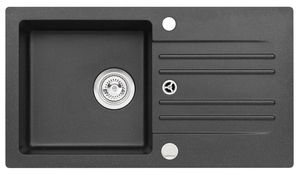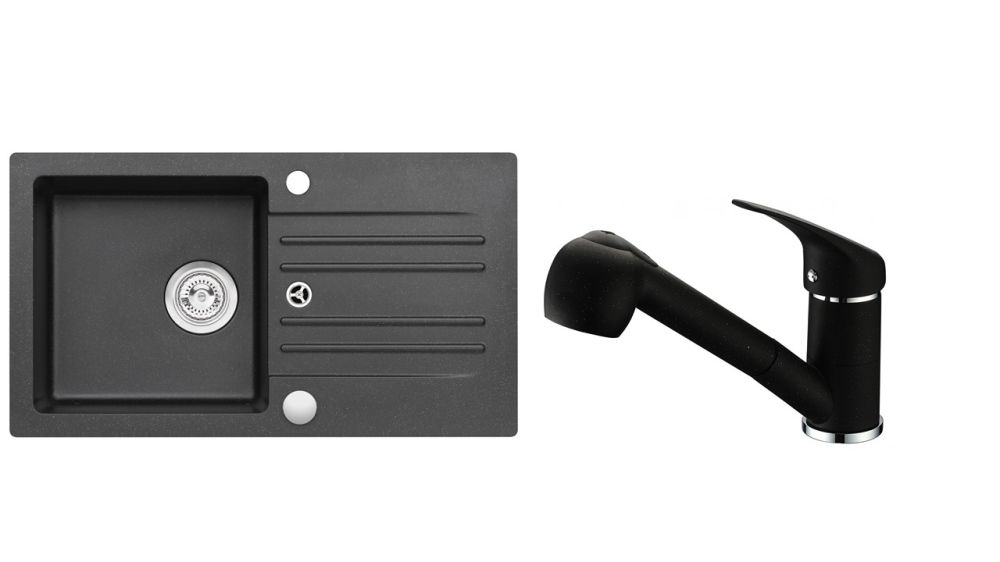 Vestavěný dřez, univerzál. Provedení : granitový dřez Vnější rozměr: 750x420 mm Rozměr vaničky: 347x348x140 mm Excentrický sítkový ventil 3 1/2 s přepadem, sifon pro úsporu místa s odbočkou na myčku. S otvorem pro baterii Návod pro instalaci v obrázcích na obale Instalace do skříňky o šířce 500 mm Baterie AM 20 Vysokotlaká baterie otočné ramínko vytahovací sprška rozměr:198 x 150 mm provedení: barevný nástřik