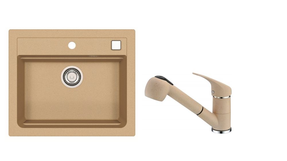 Vestavěný dřez, univerzál. Provedení : granitový dřez s odkapem Vnější rozměr: 590 x 500 mm Rozměr vaničky: 510 x 340 x 195 mm Exentrický sítkový ventil 3 1/2 s přepadem, sifon pro úsporu místa s odbočkou na myčku Úchyty a těsnění pro upevnění dřezu v balení S otvorem pro baterii Předfrézované dva otvory Návod pro instalaci v obrázcích na obale Instalace do skříňky při montáži: I- o šířce 600 mm, U- o šířce 800 mm Váha: 11,7 kg Rozměry balení (mm): 714x598x263 Baterie AM 20 Vysokotlaká baterie otočné ramínko vytahovací sprška rozměr:198 x 150 mm provedení: barevný nástřik
